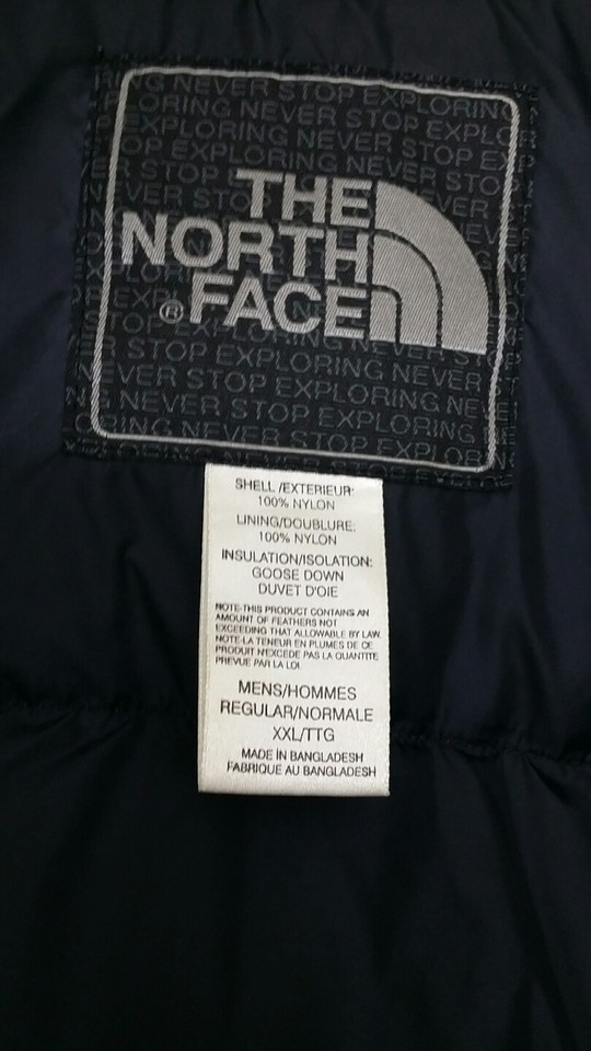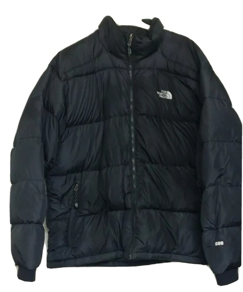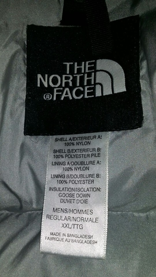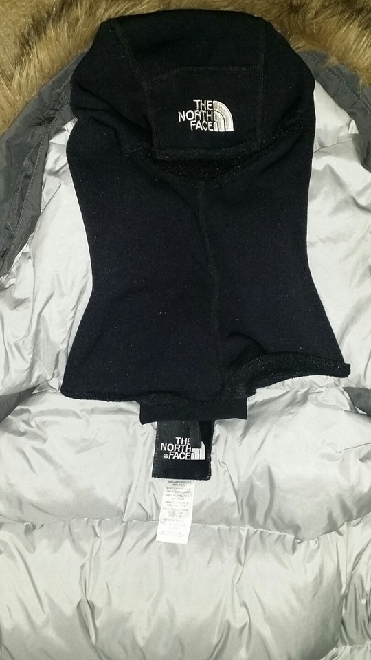 - Has embroidered logos of The North Face logo on chest and back with 700 ltd on left arm of gray parka and also on front and back of black coat, with embroidered 600 on left sleeve, all as pictured