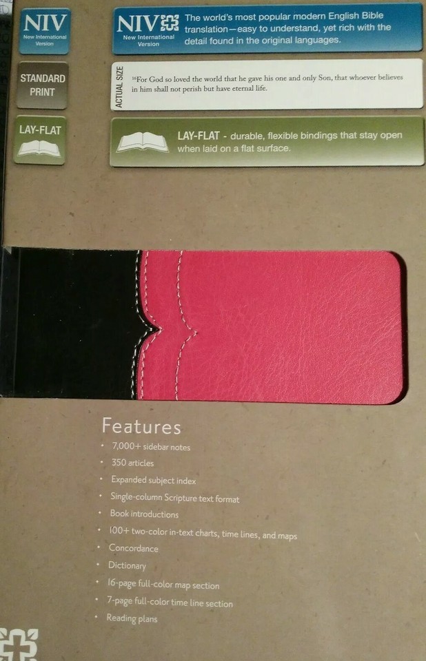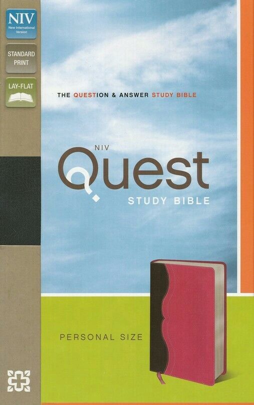 This is a listing for the new New International Version Quest Study Bible Personal Size with standard print writing and a great index. The cover is a beautiful soft Charcoal/Pink Italian faux leather Duo-Tone and will fit most bible covers size medium. The top, side and bottom edge of each page are sparkling glittery silver shimmer.