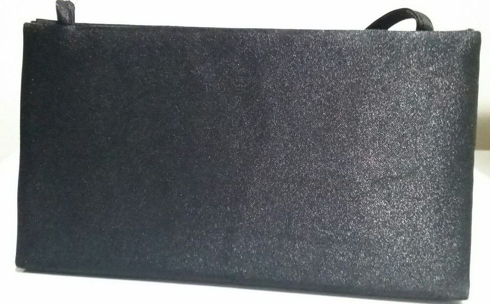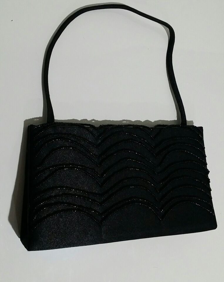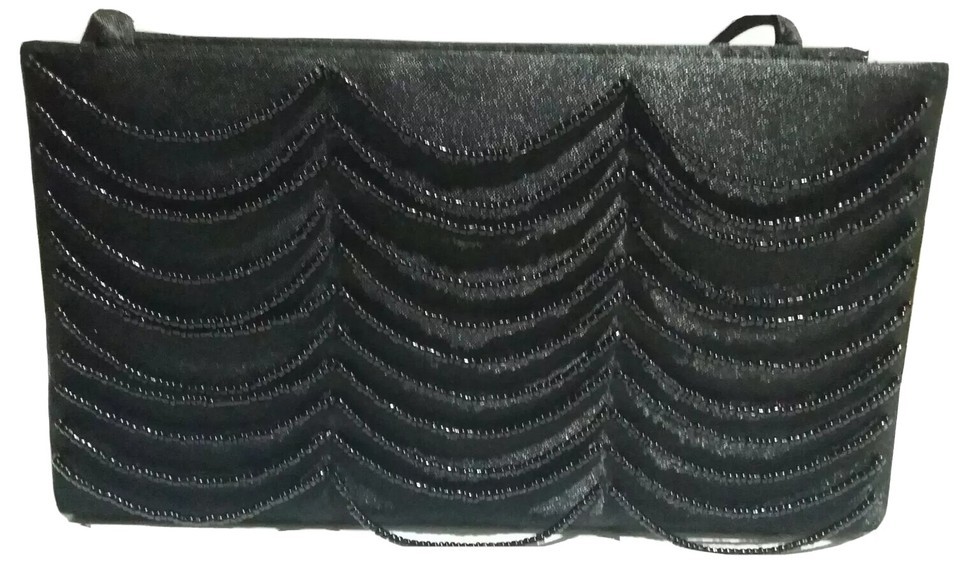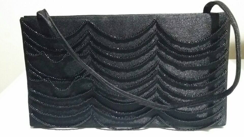 This is a listing for a pre-owned, used Victoria's Secret Very Sexy black satiny beaded evening clutch with a short 12 inch carrying strap as pictured.