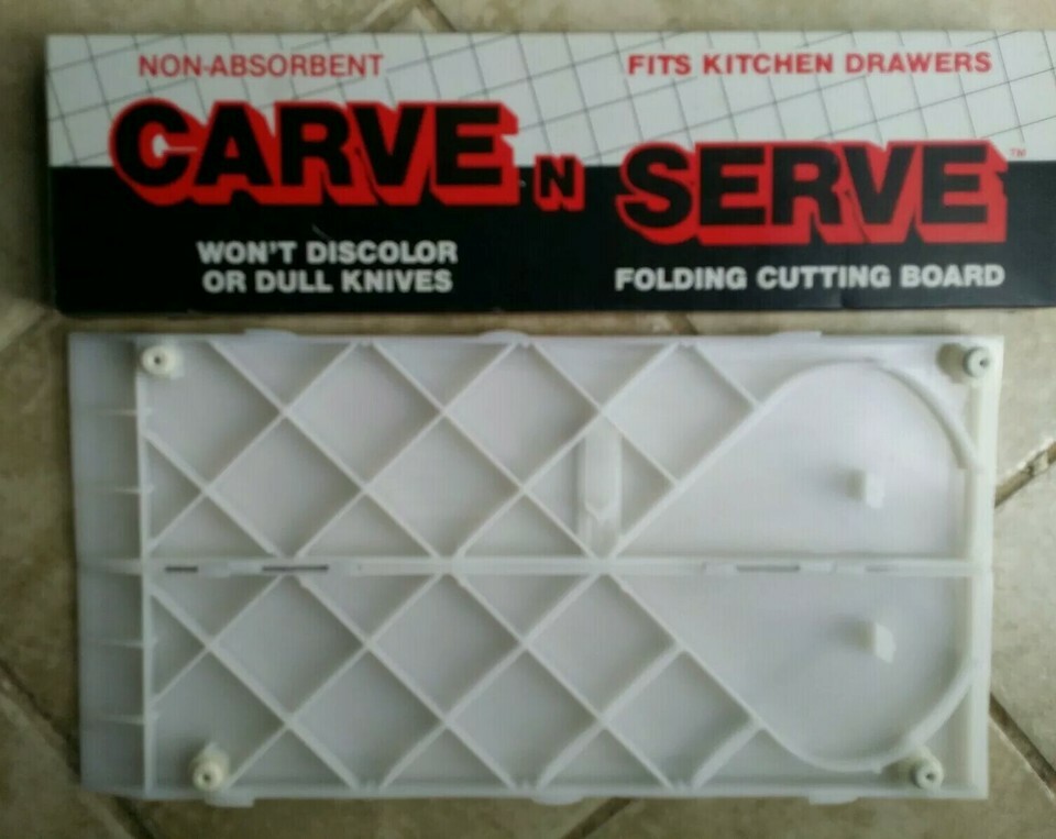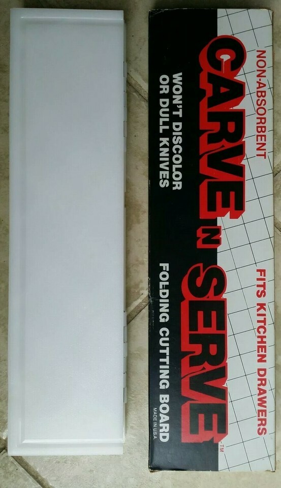 Vintage New Carve n Serve folding cutting board. Fits in kitchen drawers. Will not discolor or dull knives. Non-Absorbent. Condition is New never used.