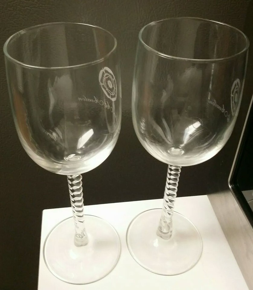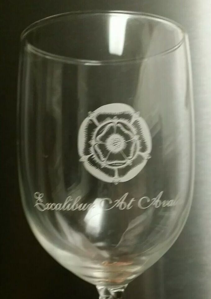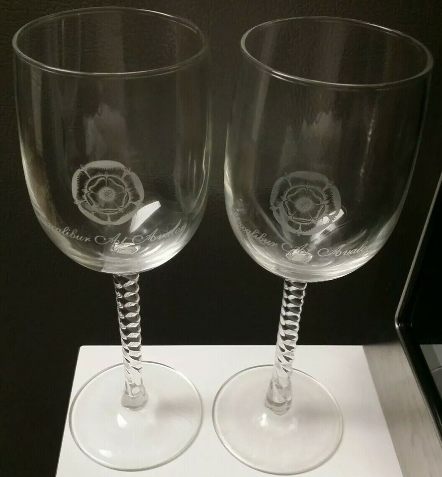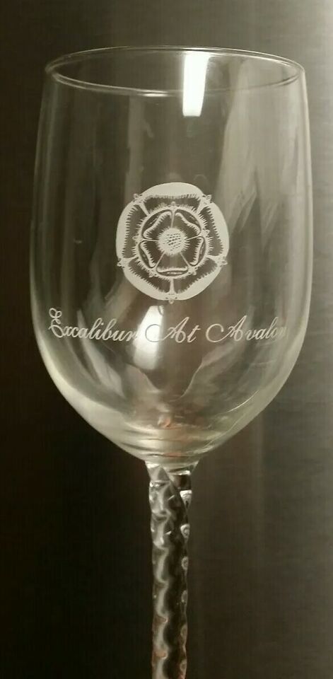 This is a listing for 2 pre-owned Clear Excalibur at Avalon Engraved Wine Glasses. These were only used as display and then in storage. No cracks or scratches. They just need a good cleaning.