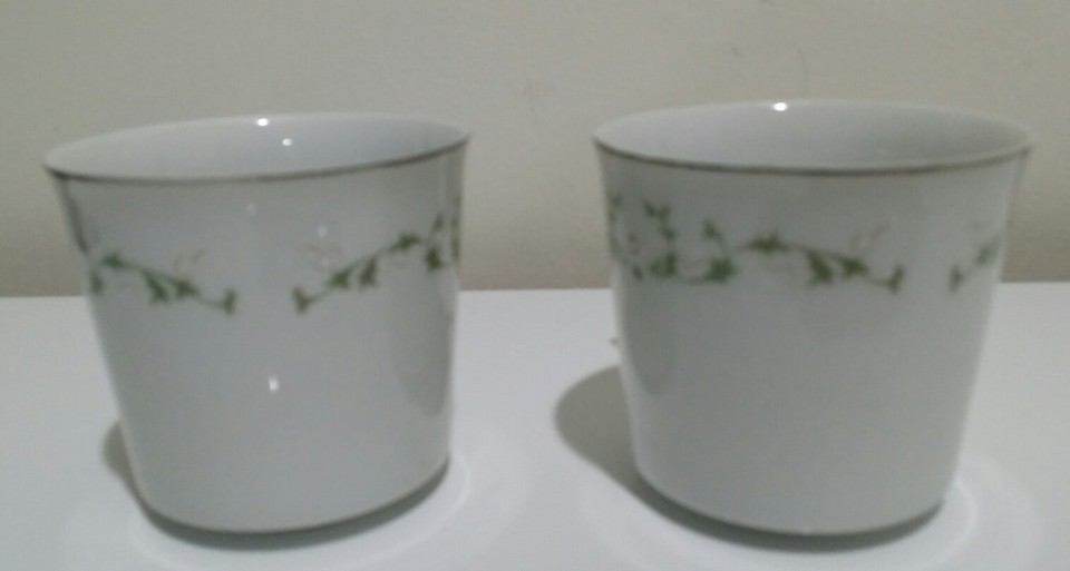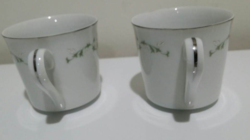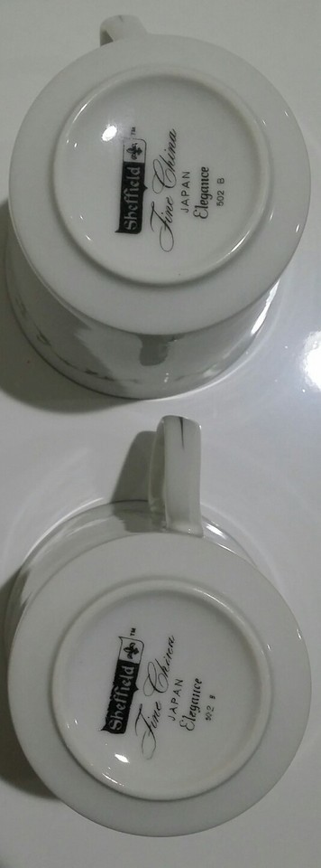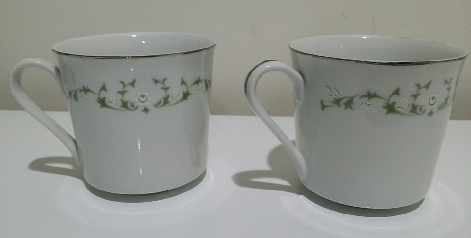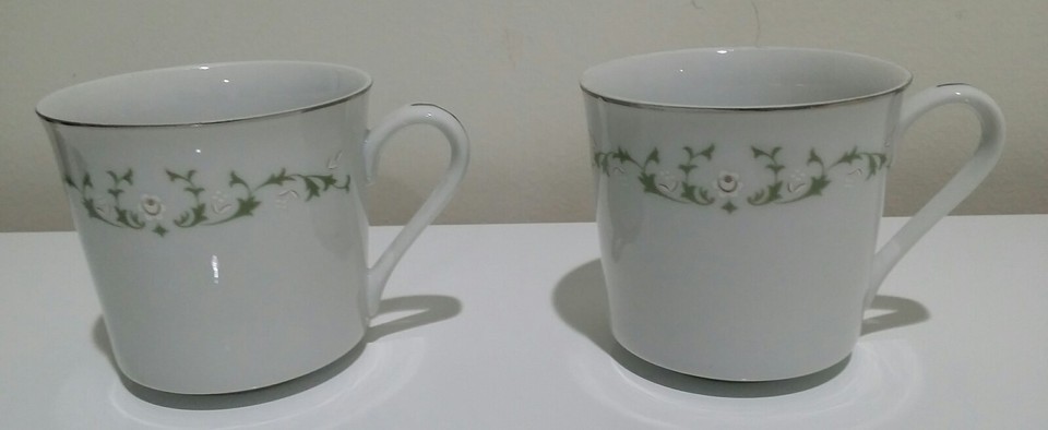 This is a listing for a used set of 2 Vintage Fine China Sheffield Elegance Design that includes 2 tea cups, with normal wear from usage each with a beautiful white floral and green leaf vine pattern with silver platinum trim around the rim of cups made in Japan just as pictured.