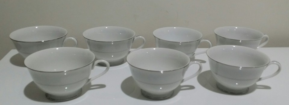 This is a listing for a used set of 7 Vintage Fine China Harmony House Mary design that includes 6 footed tea cups with normal wear from usage and age each with a beautiful silver platinum trim made in Japan just as pictured.