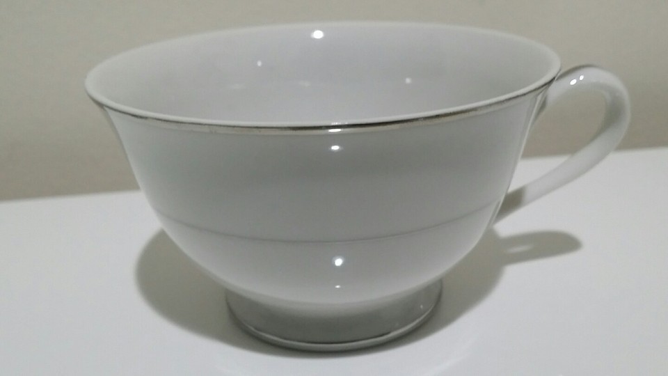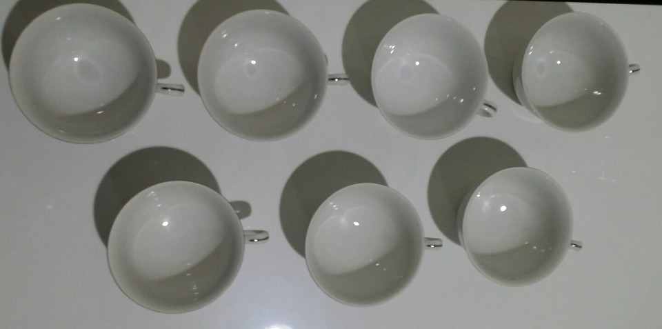 There is a stripe of silver platinum trim rim, middle, footed bottom and on the handle of each cup.