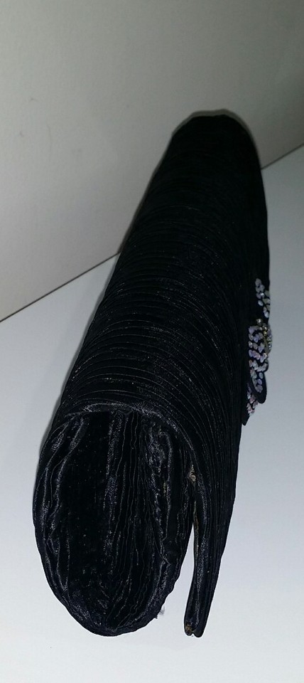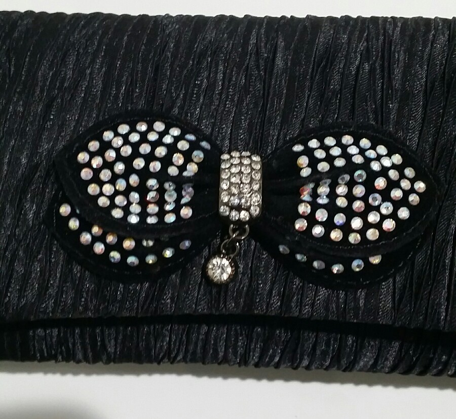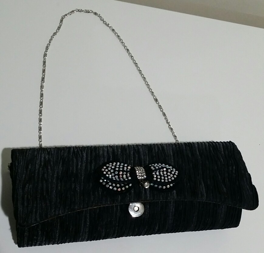 This is a listing for a new black pleated Evening clutch with a rhinestone bow front with a 50" removeable chain shoulder strap as pictured. The clutch has a shimmer in the material and the jewels on the bow are iridescent and you can see different beautiful shades of blue, purple and pink as pictured.