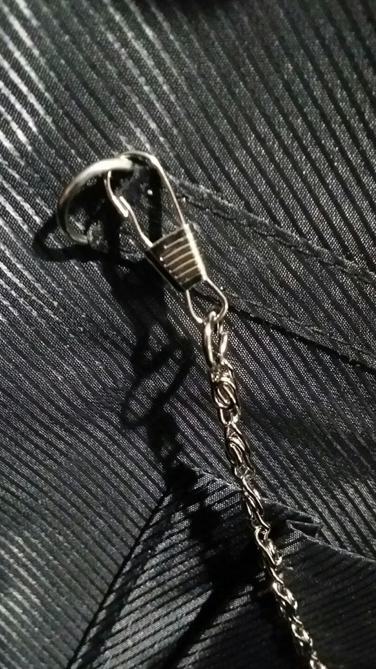 It has a a snap closure and inside pocket. The chain shoulder atrap is removeable.