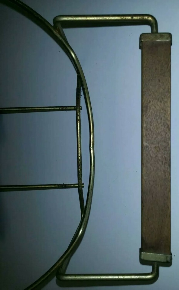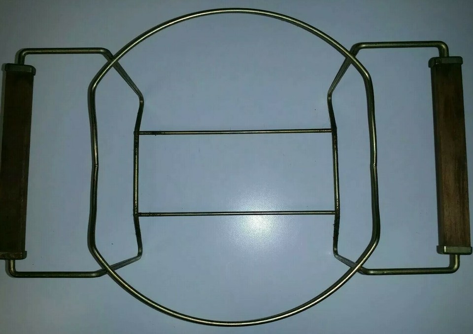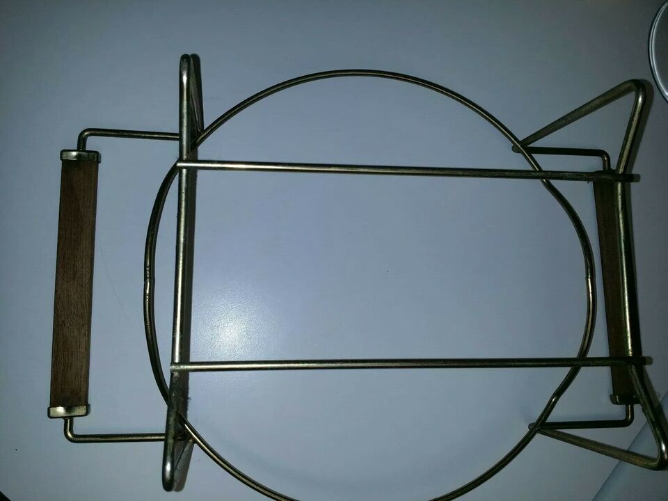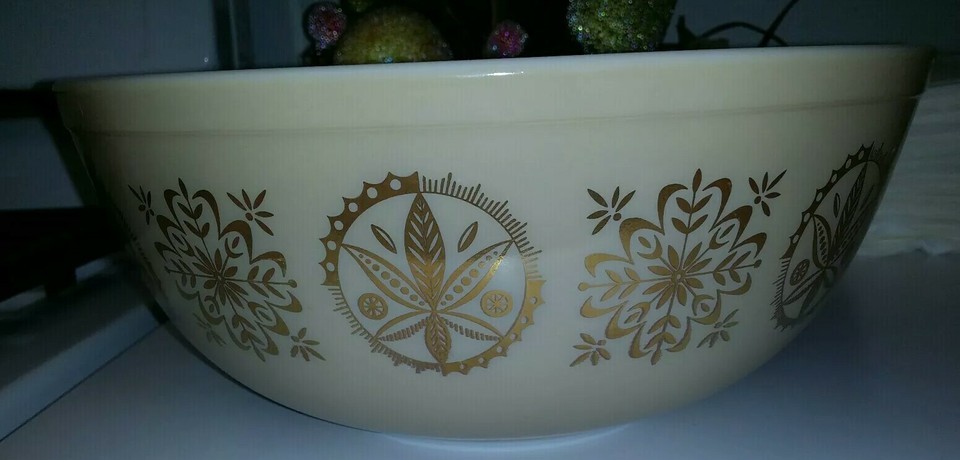 This is a pre-owned vintage Pyrex 4 quart ovenware bowl with Brass Gold Serving Stand Holder Tan with Gold designs model number 404 as pictured.