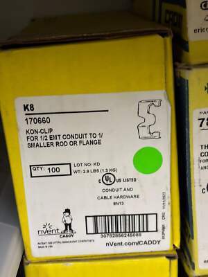 100-Pack NVENT Caddy K8 Steel, 1/2" EMT, 1/2" Rigid Cable/Conduit Clip Cable/Conduit Clip Type; Caddy Armour Spring Steel Material; UL (Canada and Us) Approval; 100 Per Pack Standard Package; 15 Pound (Vertical), 100 Pound (Horizontal) Load Capacity Loc J-1-B Listed By: Gabe (The Help Resale Team) ?The road to success and the road to failure are almost exactly the same.? ?Colin R. Davis (A positive moment brought to you by Help Resale) About Us Welcome to Help Resale, your go-to consignment shop where value meets quality. At Help Resale, we're dedicated to providing you with an exceptional shopping experience, whether you're looking to find the best deals or consign your items. Need to buy a product, but don't see it in our store? Please feel free to reach out to us and we will help you find it! Help Resale 7200 Fair Oaks Blvd Suite 120 Carmichael CA 95608 Business Hours: Monday-Friday: 9:00 am to 5:00 pm (PST) All product and company names are trademarks TM or registered trademarks of their respective holders. Use of them does not imply any affiliation with or endorsement by them.