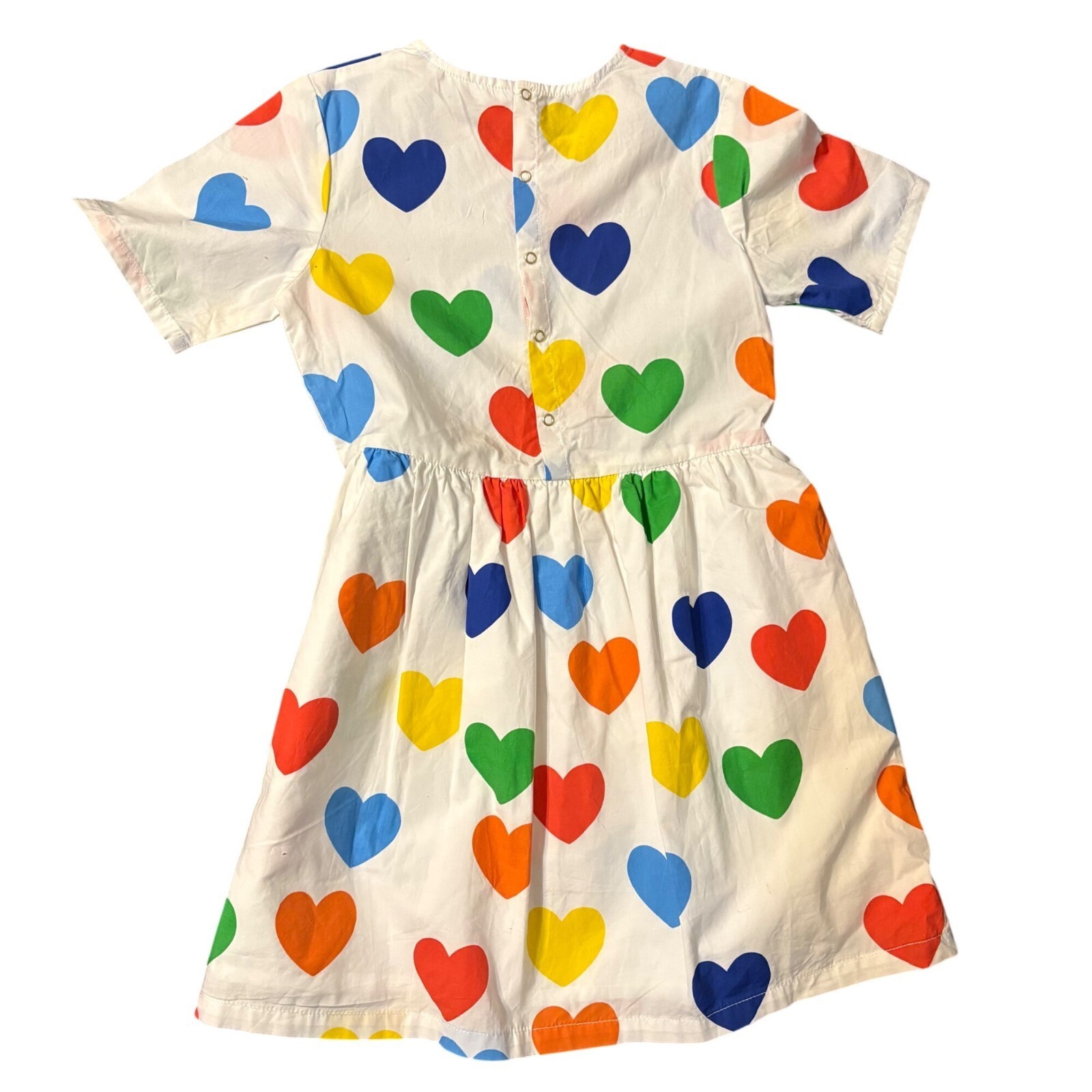 Short sleeves summer dress by Mini Rodini. In white cotton with all over RAINBOW HEARTS print. Featuring a round neck and a pushbutton closure at centre back. Bright and colorful, this dress features a playful multicolor heart pattern with a comfortable organic cotton fabric and functional button-back design.