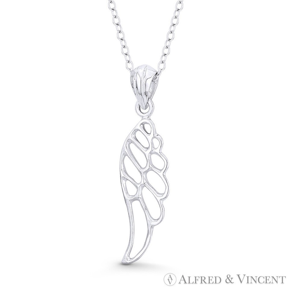 The featured pendant is cast in .925 sterling silver and showcases an angel's wing design w/ open cut-outs. The wing charm is then finished with a sturdy bail that can accommodate most standard-width chains.