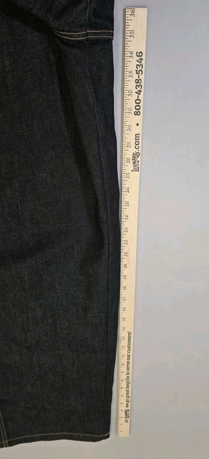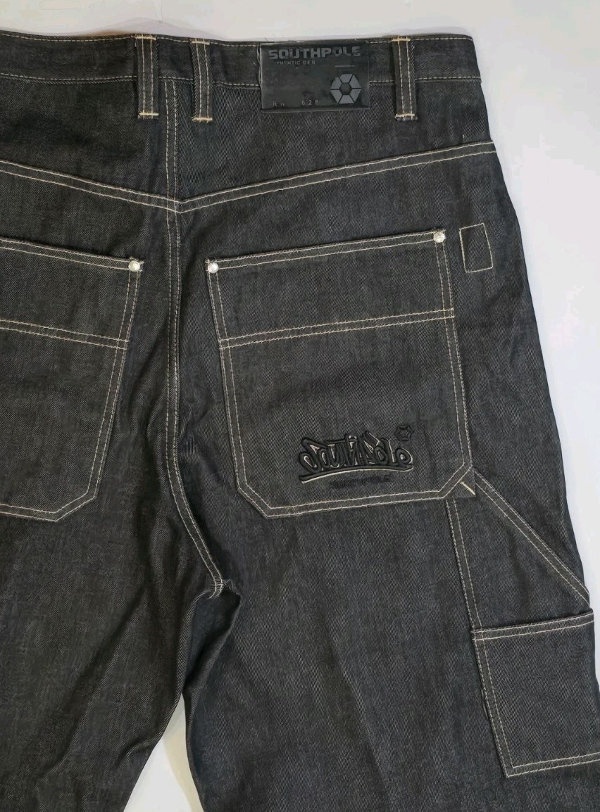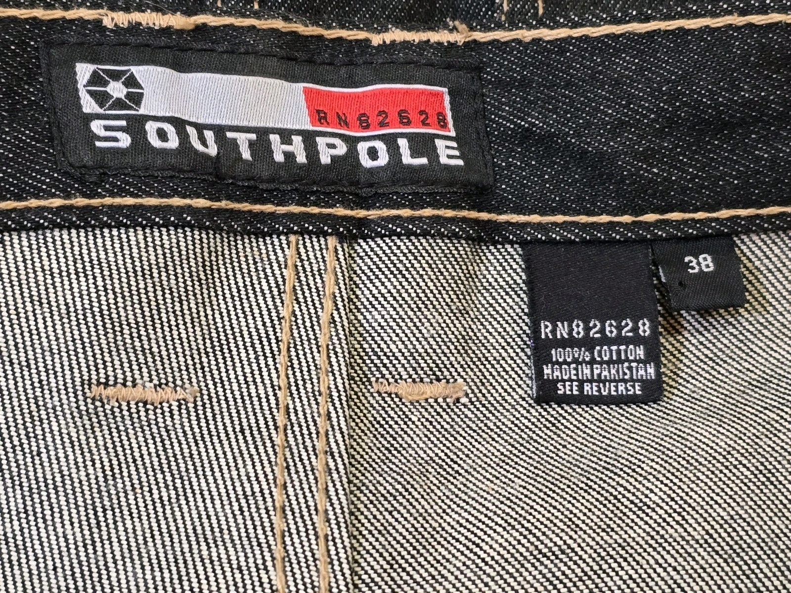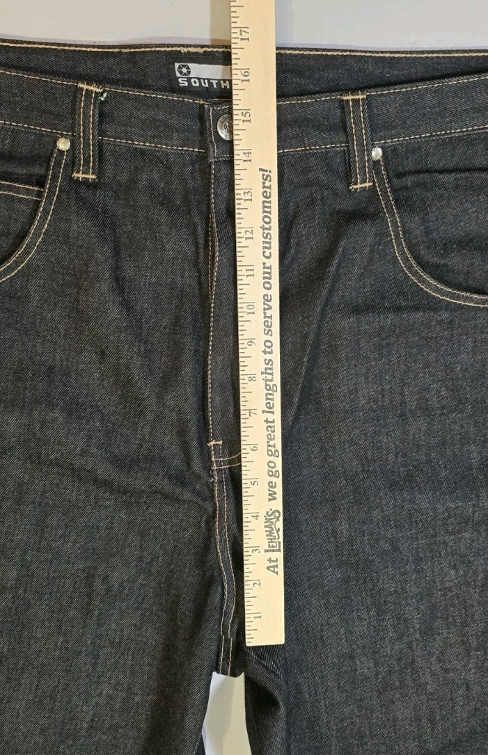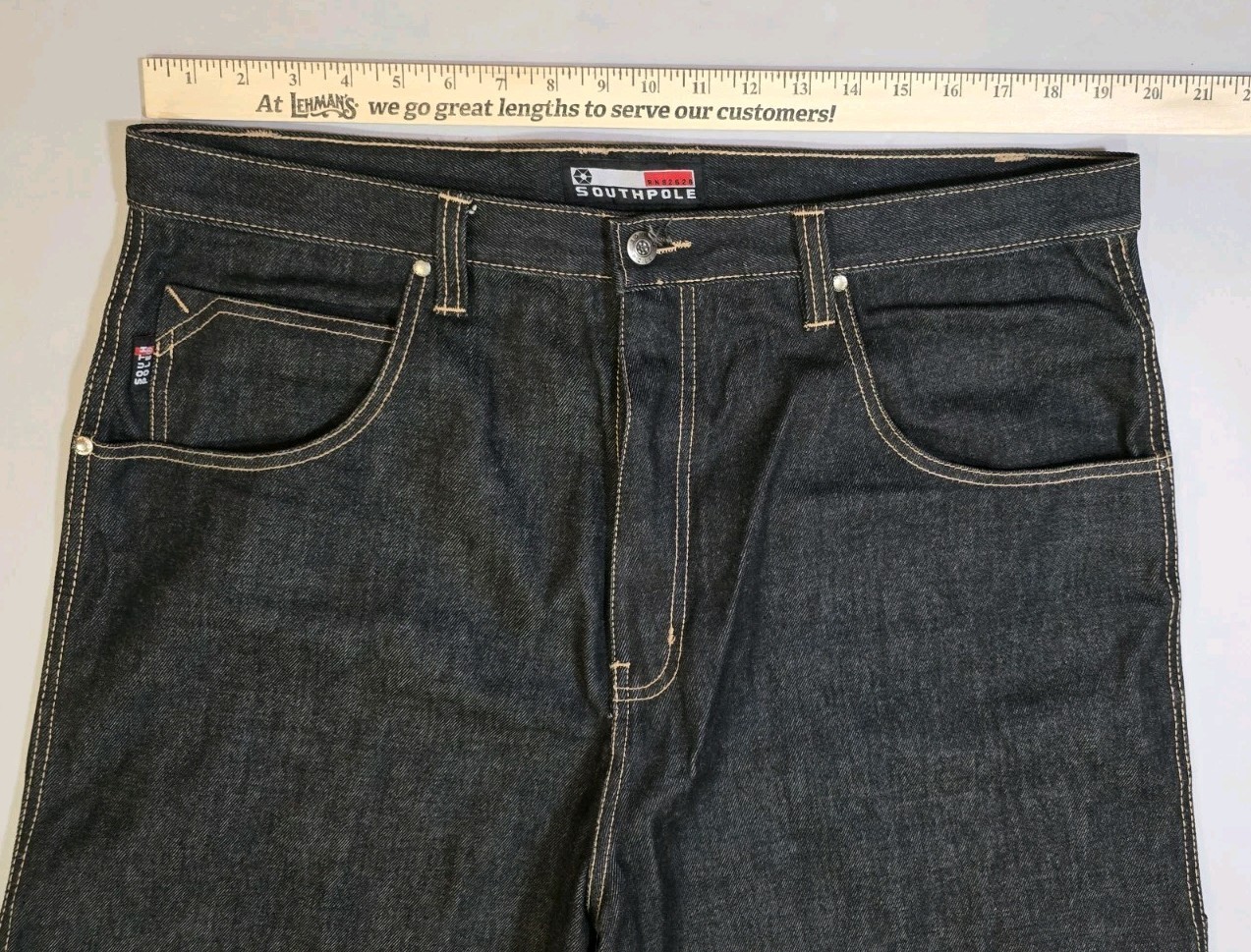 Please see all photos including two photos that show leg cuff heal drag wear. Some logo wear on back leather logo tag. The product is a pair of NWT Southpole Embroidered Carpenters Jeans in size 38, featuring a wide leg fit in black denim. These jeans are made of cotton denim with a dark wash, and have a solid pattern with embroidered accents. They have a zip and button closure, a high rise, and are machine washable for easy care. These relaxed fit jeans also feature pockets for added convenience and comfort, making them a stylish and practical choice for men's wardrobe.