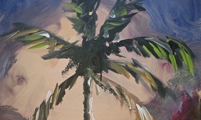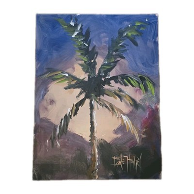 This Dale Henry PAINTMAN painting showcases a tropical palm tree scene with nature elements. The painting is signed by the artist and is an original piece using his signature speed style art. It is made on a large canvas with a contemporary art. The painting is 40 inches in height and 30 inches in length. The artist is from Florida, USA.
