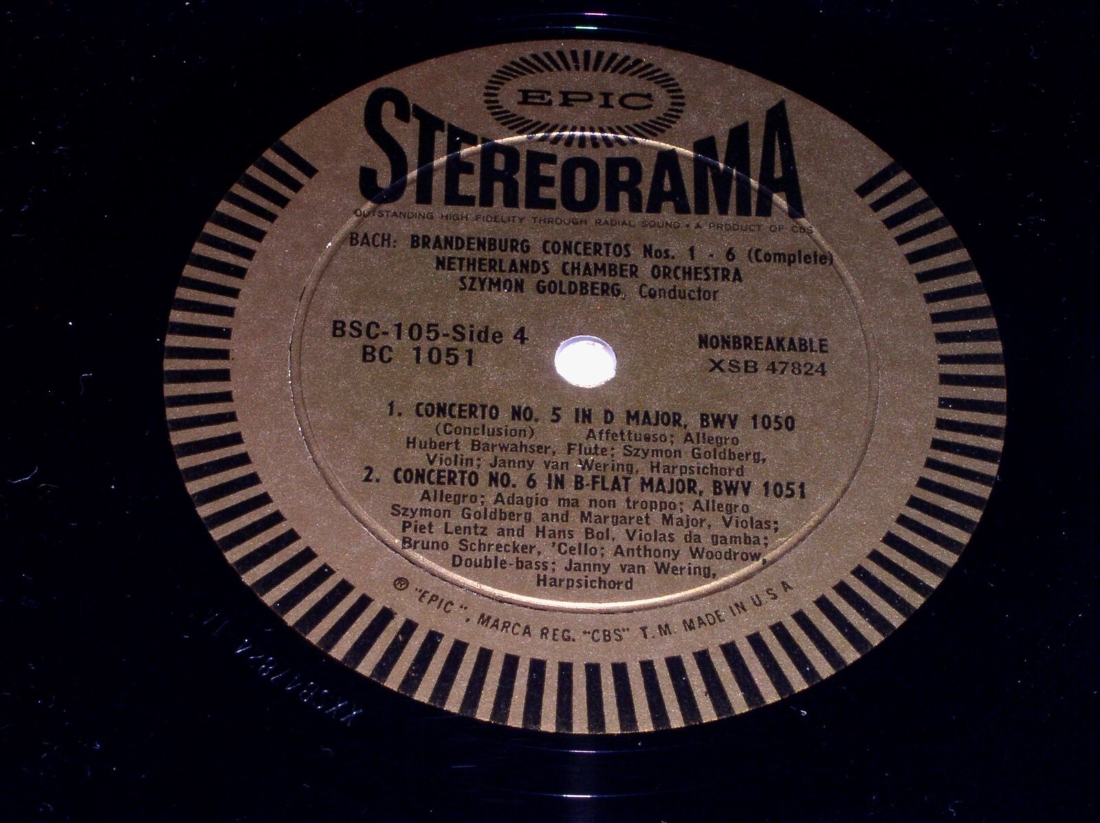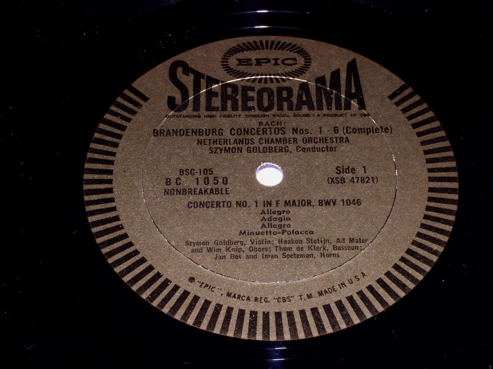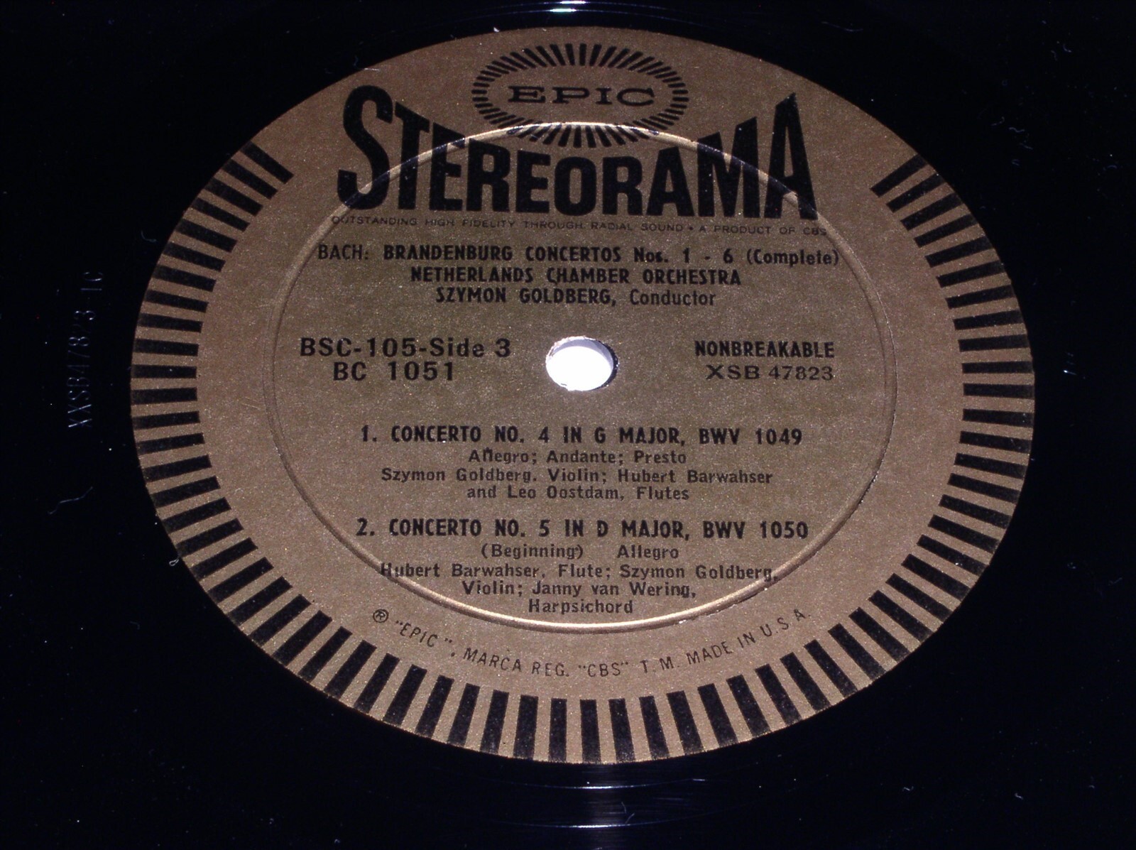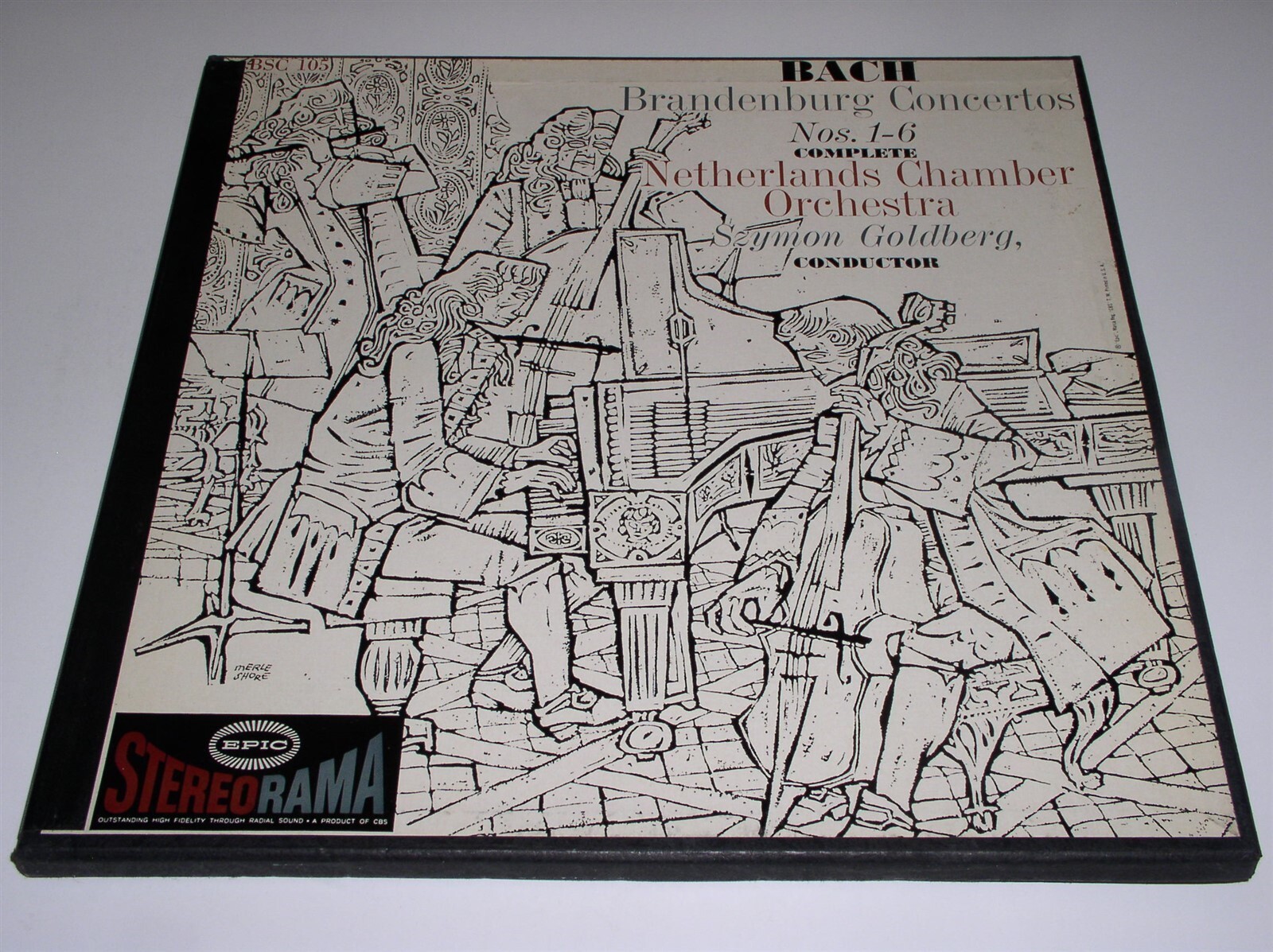 This is a vintage Classical Music phonograph record album 2 disc boxed set entitled, "Bach Brandenburg Cioncertos Nos. 1-6 Complete". Netherlands Chamber Orchestra. Szymon Goldberg conductor. Record label: Epic Sterorama BSC 105 (Stereo).