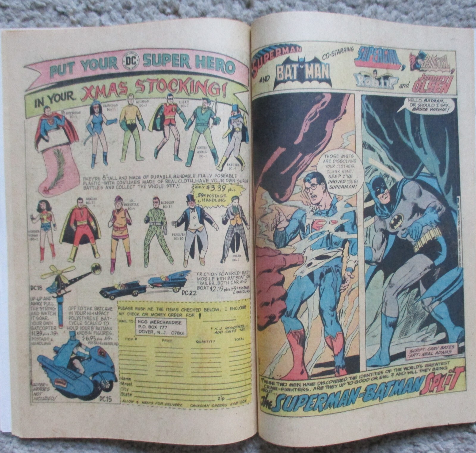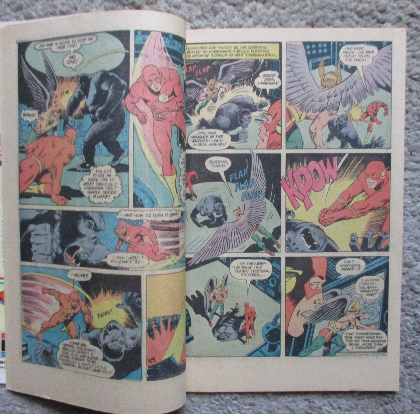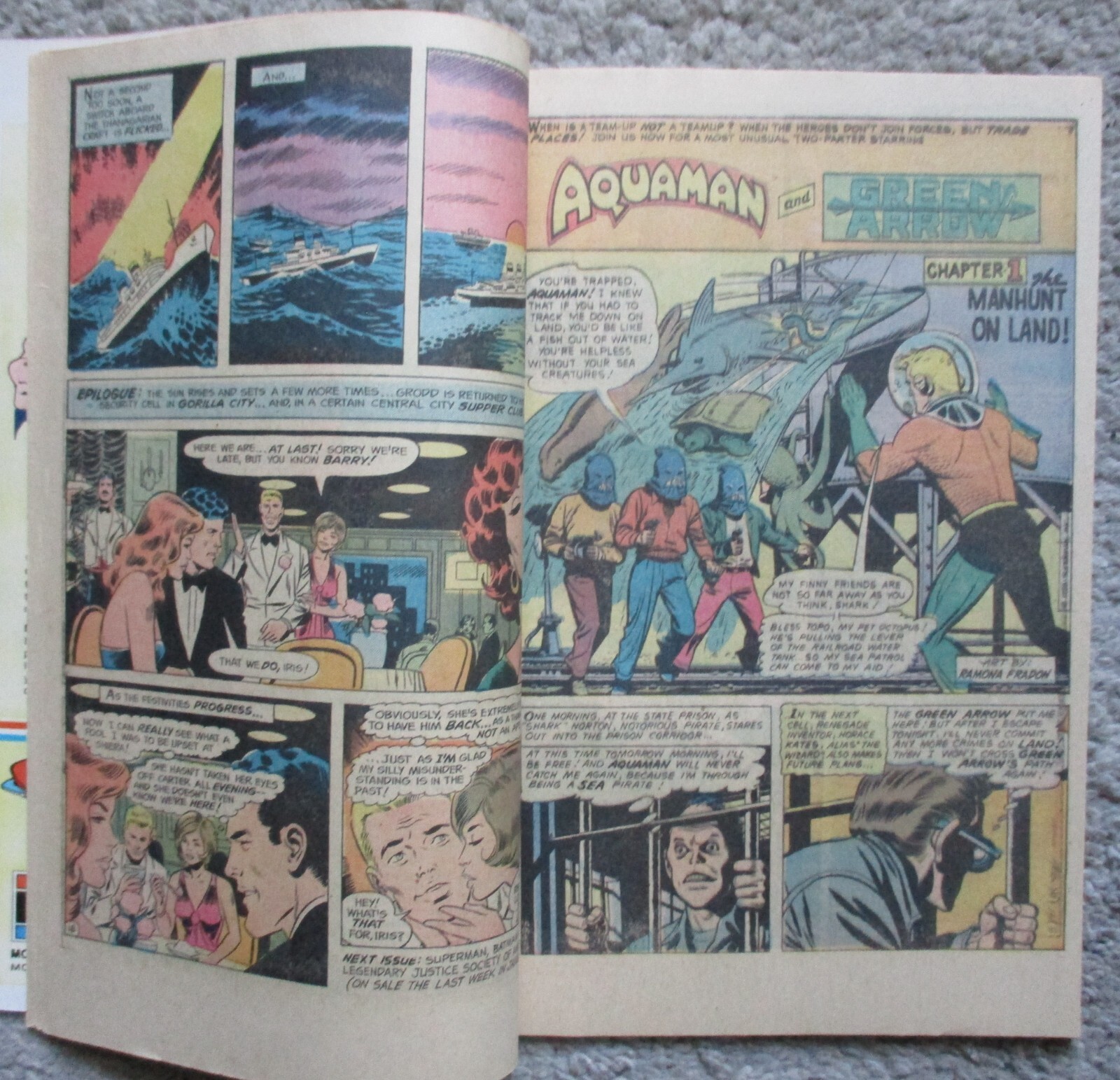 The Flash and Hawkman battle Gorilla Grodd in "Gorilla My Dreams" (script by Steve Skeates, pencils by Ric Estrada, inks by Wally Wood). Reprints: Aquaman and Green Arrow in "The Manhunt on Land" (art by Ramona Fradon and Lee Elias); Superman and Batman star in "The Superman-Batman Split" (script by Cary Bates, art by Neal Adams). Captain Marvel stars in a one-page Hostess ad, "The Cup Cake Caper." Frank Brunner cover. Cover price $0.50.