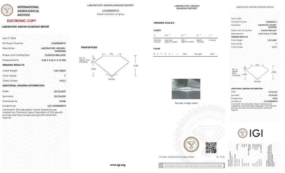 Terms Conditions:Kindly keep this in mind before making your purchase that we are selling our Lab grown diamonds on multiple platforms. The Diamond you receive will be exact color, clarity and cut. The only difference could be the IGI certificate which might differ from the listed stone. We highly appreciate your cooperation. LabIGIReport #-ShapeCushionCarat2.58ColorEClarityVVS2Cut-PolishExcellentSymExcellentFluorNoneLocationNew York, UsaDepth64.4%Table62%GirdleMedium - FACETEDCrown12.5%, 33.3Pavillion48.5%, 38.1CuletNoneMeas9.45 x 7.35 x 4.73Ratio1.29BGM-Growth TypeCVDPlease note that we are listing all of our stone's color clarity grade as per IGI Lab Report. IGI Lab is the 2nd most reputable trustworthy Lab after GIA. Every person can have a different opinion about the color clarity of the stone. So the stones you are getting can be e to g in color vvs2 to vs2 in clarity grades as per GIA standards but as IGI standards those are as mentioned in the listing. how practical it is to use $75000 (3 Carat E VS!) Natural Diamond stone standard for the same color clarity grade (3 Carat EVS1) Lab Grown Stone which you are getting for $750. My advice to you is whatever authenticity says please please get the stone if you do not like then I will accept the return without any question in the next 30 days of purchase. I don't want you to miss the great opportunity to buy those beautiful lab grown stones which are 100% the same chemical other properties wise as natural Diamonds at 1% of price compared to Natural Diamond.