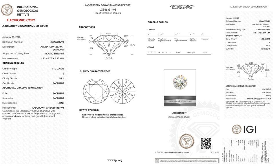Terms Conditions:Kindly keep this in mind before making your purchase that we are selling our Lab grown diamonds on multiple platforms. The Diamond you receive will be exact color, clarity and cut. The only difference could be the IGI certificate which might differ from the listed stone. We highly appreciate your cooperation. Stock#734888Report No-ShapeROUNDCts1.10ColorEClarityVS1LabIGICutEXPolEXSymEXFlourNONEDepth%58.7Table%62Length6.73Width6.75Depth3.95Ratio-CuletPOINTEDC/A-C/H12P/A-P/H43 - 40.7BrandCVDCountry Of Origin-HCAPlease note that we are listing all of our stone's color clarity grade as per IGI Lab Report. IGI Lab is the 2nd most reputable trustworthy Lab after GIA. So the stones you are getting can be e to g in color vs1 to si1 in clarity grades as per GIA standards but as IGI standards those are as mentioned in the listing. Every person can have a different opinion about the color clarity of the stone. I am not sure how practical it is to use $75000 (3 Carat E VS!) Natural Diamond stone standard for the same color clarity grade (3 Carat EVS1) Lab Grown Stone which you are getting for $750. My advice to you is whatever authenticity says please please get the stone if you do not like then I will accept the return without any question in the next 30 days of purchase. I don't want you to miss the great opportunity to buy those beautiful lab grown stones which are 100% the same chemical other properties wise as natural Diamonds at 1% of price compared to Natural Diamond.