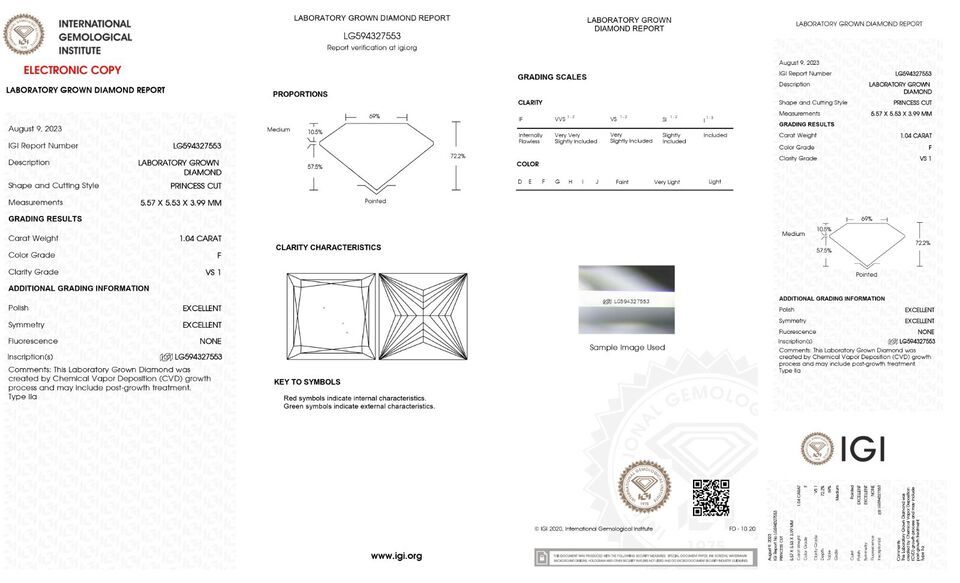 ? Please note that we will ship you same stone or exact similar stone with same color, clarity same carat weight certified stone. All Our Diamonds Are Certified And Laser inscripted.all of our diamonds are tested and certified with labs like IGI, GIA ,Etc.LabIGIReport #-ShapePrincessCarat1.04ColorFClarityVS1Cut-PolishExcellentSymExcellentFluorNoneLocationNew York, United StatesDepth72.2%Table69%GirdleMedium (M-M)Crown0.0%, 0.0Pavillion0.0%, 0.0CuletNoneMeas5.57 x 5.53 x 3.99Ratio1.01BGMNoneGrowth TypeCVDPlease note that we are listing all of our stone's color clarity grade as per IGI Lab Report. IGI Lab is the 2nd most reputable trustworthy Lab after GIA. Every person can have a different opinion about the color clarity of the stone. So the stones you are getting can be one or two grades lower in color clarity grade as per GIA standards but as IGI standards those are as mentioned in the listing. So the stones you are getting can be f to h in color vs1 to si1 in clarity grades as per GIA standards but as IGI standards those are as mentioned in the listing. how practical it is to use $75000 (3 Carat E VS!) Natural Diamond stone standard for the same color clarity grade (3 Carat EVS1) Lab Grown Stone which you are getting for $750. My advice to you is whatever authenticity says please please get the stone if you do not like then I will accept the return without any question in the next 30 days of purchase. I don't want you to miss the great opportunity to buy those beautiful lab grown stones which are 100% the same chemical other properties wise as natural Diamonds at 1% of price compared to Natural Diamond.