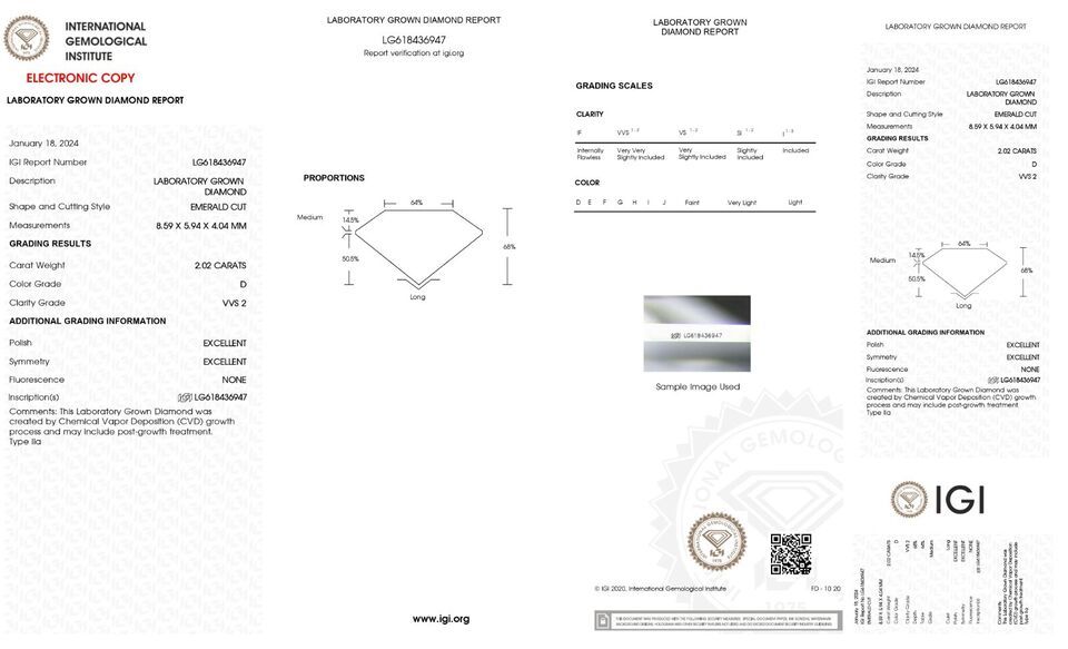 Terms Conditions:Kindly keep this in mind before making your purchase that we are selling our Lab grown diamonds on multiple platforms. The Diamond you receive will be exact color, clarity and cut. The only difference could be the IGI certificate which might differ from the listed stone. We highly appreciate your cooperation.LabIGIReport #-ShapeEmeraldCarat2.02ColorDClarityVVS2Cut-PolishExcellentSymExcellentFluorNoneLocationNew York, United StatesDepth68.0%Table64%Girdle-Crown14.5%, 37.0Pavillion50.5%, 40.8CuletLargeMeas8.59 x 5.94 x 4.04Ratio1.45BGMNoneGrowth TypeCVDPlease note that we are listing all of our stone's color clarity grade as per IGI Lab Report. IGI Lab is the 2nd most reputable trustworthy Lab after GIA. So the stones you are getting can be d to f in color vvs2 to vs2 in clarity grades as per GIA standards but as IGI standards those are as mentioned in the listing. Every person can have a different opinion about the color clarity of the stone. I am not sure how practical it is to use $75000 (3 Carat E VS!) Natural Diamond stone standard for the same color clarity grade (3 Carat EVS1) Lab Grown Stone which you are getting for $750. My advice to you is whatever authenticity says please please get the stone if you do not like then I will accept the return without any question in the next 30 days of purchase. I don't want you to miss the great opportunity to buy those beautiful lab grown stones which are 100% the same chemical other properties wise as natural Diamonds at 1% of price compared to Natural Diamond.