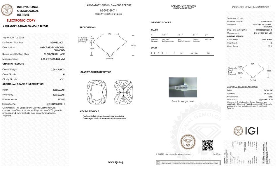 ? Please note that we will ship you same stone or exact similar stone with same color, clarity same carat weight certified stone. All Our Diamonds Are Certified And Laser inscripted.all of our diamonds are tested and certified with labs like IGI, GIA ,Etc.LabIGIReport #-ShapeCushionCarat2.56ColorHClarityVS1Cut-PolishExcellentSymExcellentFluorNoneLocationNew York, United StatesDepth68.6%Table62%GirdleMedium-Slightly Thick (FT)Crown12.5%, 32.9Pavillion52.5%, 37.0CuletNoneMeas9.73 x 7.13 x 4.89Ratio1.36BGMNoneGrowth TypeCVDPlease note that we are listing all of our stone's color clarity grade as per IGI Lab Report. IGI Lab is the 2nd most reputable trustworthy Lab after GIA. Every person can have a different opinion about the color clarity of the stone. So the stones you are getting can be one or two grades lower in color clarity grade as per GIA standards but as IGI standards those are as mentioned in the listing. So the stones you are getting can be h to j in color vs1 to si1 in clarity grades as per GIA standards but as IGI standards those are as mentioned in the listing. how practical it is to use $75000 (3 Carat E VS!) Natural Diamond stone standard for the same color clarity grade (3 Carat EVS1) Lab Grown Stone which you are getting for $750. My advice to you is whatever authenticity says please please get the stone if you do not like then I will accept the return without any question in the next 30 days of purchase. I don't want you to miss the great opportunity to buy those beautiful lab grown stones which are 100% the same chemical other properties wise as natural Diamonds at 1% of price compared to Natural Diamond.