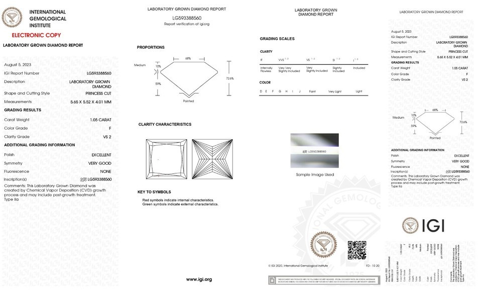 ? Please note that we will ship you same stone or exact similar stone with same color, clarity same carat weight certified stone. All Our Diamonds Are Certified And Laser inscripted.all of our diamonds are tested and certified with labs like IGI, GIA ,Etc.LabIGIReport #-ShapePrincessCarat1.05ColorFClarityVS2Cut-PolishExcellentSymVery GoodFluorNoneLocationNew York, United StatesDepth72.6%Table68%GirdleMediumCrown10.0%, 35.3Pavillion59.0%, 39.7Culet-Meas5.65 x 5.52 x 4.01Ratio1.02BGMNoneGrowth TypeCVDPlease note that we are listing all of our stone's color clarity grade as per IGI Lab Report. IGI Lab is the 2nd most reputable trustworthy Lab after GIA. Every person can have a different opinion about the color clarity of the stone. So the stones you are getting can be one or two grades lower in color clarity grade as per GIA standards but as IGI standards those are as mentioned in the listing. So the stones you are getting can be f to h in color vs2 to si2 in clarity grades as per GIA standards but as IGI standards those are as mentioned in the listing. how practical it is to use $75000 (3 Carat E VS!) Natural Diamond stone standard for the same color clarity grade (3 Carat EVS1) Lab Grown Stone which you are getting for $750. My advice to you is whatever authenticity says please please get the stone if you do not like then I will accept the return without any question in the next 30 days of purchase. I don't want you to miss the great opportunity to buy those beautiful lab grown stones which are 100% the same chemical other properties wise as natural Diamonds at 1% of price compared to Natural Diamond.