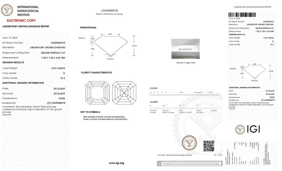 Terms Conditions:Kindly keep this in mind before making your purchase that we are selling our Lab grown diamonds on multiple platforms. The Diamond you receive will be exact color, clarity and cut. The only difference could be the IGI certificate which might differ from the listed stone. We highly appreciate your cooperation.LabIGIReport #-ShapeAsscherCarat2.29ColorGClarityVS2Cut-PolishExcellentSymExcellentFluorNoneLocationNew York, United StatesDepth63.3%Table66%GirdleMediumCrown14.5%, 36.5Pavillion46.0%, 40.1CuletNoneMeas7.38 x 7.30 x 4.62Ratio1.01BGMBGMGrowth TypeCVDPlease note that we are listing all of our stone's color clarity grade as per IGI Lab Report. IGI Lab is the 2nd most reputable trustworthy Lab after GIA. Every person can have a different opinion about the color clarity of the stone. So the stones you are getting can be one or two grades lower in color clarity grade as per GIA standards but as IGI standards those are as mentioned in the listing. So the stones you are getting can be g to i in color vs2 to si2 in clarity grades as per GIA standards but as IGI standards those are as mentioned in the listing. how practical it is to use $75000 (3 Carat E VS!) Natural Diamond stone standard for the same color clarity grade (3 Carat EVS1) Lab Grown Stone which you are getting for $750. My advice to you is whatever authenticity says please please get the stone if you do not like then I will accept the return without any question in the next 30 days of purchase. I don't want you to miss the great opportunity to buy those beautiful lab grown stones which are 100% the same chemical other properties wise as natural Diamonds at 1% of price compared to Natural Diamond.
