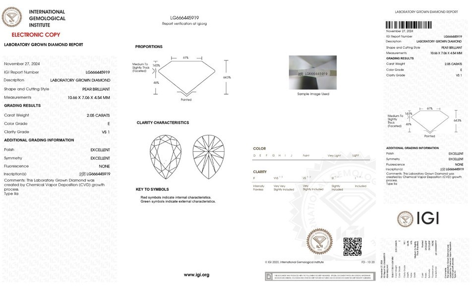 Stock#722764Report NoLG529287466ShapePEARCts0.70ColorEClarityVS1LabIGICutEXPolEXSymVGFlourNONEDepth%62.7Table%62Length7.68Width5.07Depth3.18Ratio1.51CuletPOINTEDC/A-C/H11P/A42.9P/H46.5BrandCVDCountry Of Origin-HCAPlease note that we are listing all of our stone's color clarity grade as per IGI Lab Report. IGI Lab is the 2nd most reputable trustworthy Lab after GIA. So the stones you are getting can be e to g in color vs 1 to si1 in clarity grades as per GIA standards but as IGI standards those are as mentioned in the listing. Every person can have a different opinion about the color clarity of the stone. So the stones you are getting can be one or two grades lower in color clarity grade as per GIA standards but as IGI standards those are as mentioned in the listing. I am not sure how practical it is to use $75000 (3 Carat E VS!) Natural Diamond stone standard for the same color clarity grade (3 Carat EVS1) Lab Grown Stone which you are getting for $750. My advice to you is whatever authenticity says please please get the stone if you do not like then I will accept the return without any question in the next 30 days of purchase. I don't want you to miss the great opportunity to buy those beautiful lab grown stones which are 100% the same chemical other properties wise as natural Diamonds at 1% of price compared to Natural Diamond.