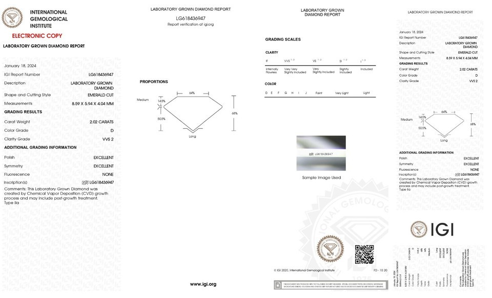Terms Conditions:Kindly keep this in mind before making your purchase that we are selling our Lab grown diamonds on multiple platforms. The Diamond you receive will be exact color, clarity and cut. The only difference could be the IGI certificate which might differ from the listed stone. We highly appreciate your cooperation.LabIGIReport #LG621482701ShapeEmeraldCarat2.08ColorFClarityVVS2Cut-PolishExcellentSymExcellentFluorNoneLocationNew York, United StatesDepth68.0%Table64%Girdle-Crown14.5%, 37.0Pavillion50.5%, 40.8CuletLargeMeas8.59 x 5.94 x 4.04Ratio1.45BGMNoneGrowth TypeCVDPlease note that we are listing all of our stone's color clarity grade as per IGI Lab Report. IGI Lab is the 2nd most reputable trustworthy Lab after GIA. So the stones you are getting can be f to h in color vvs2 to vs2 in clarity grades as per GIA standards but as IGI standards those are as mentioned in the listing. Every person can have a different opinion about the color clarity of the stone. I am not sure how practical it is to use $75000 (3 Carat E VS!) Natural Diamond stone standard for the same color clarity grade (3 Carat EVS1) Lab Grown Stone which you are getting for $750. My advice to you is whatever authenticity says please please get the stone if you do not like then I will accept the return without any question in the next 30 days of purchase. I don't want you to miss the great opportunity to buy those beautiful lab grown stones which are 100% the same chemical other properties wise as natural Diamonds at 1% of price compared to Natural Diamond.