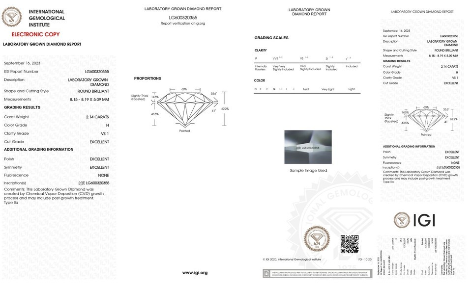 ? Please note that we will ship you same stone or exact similar stone with same color, clarity same carat weight certified stone. All Our Diamonds Are Certified And Laser inscripted.all of our diamonds are tested and certified with labs like IGI, GIA ,Etc.LabIGIReport #-ShapeRoundCarat2.14ColorHClarityVS1CutExcellentPolishExcellentSymExcellentFluorNoneLocationNew York, United StatesDepth62.2%Table60%GirdleSlightly ThickCrown14.5%Pavillion0.0%CuletNoneMeas8.15 x 8.19 x 5.09Ratio-BGM-Growth TypeCVDPlease note that we are listing all of our stone's color clarity grade as per IGI Lab Report. IGI Lab is the 2nd most reputable trustworthy Lab after GIA. Every person can have a different opinion about the color clarity of the stone. So the stones you are getting can be h to j in color vs1 to si1 in clarity grades as per GIA standards but as IGI standards those are as mentioned in the listing. how practical it is to use $75000 (3 Carat E VS!) Natural Diamond stone standard for the same color clarity grade (3 Carat EVS1) Lab Grown Stone which you are getting for $750. My advice to you is whatever authenticity says please please get the stone if you do not like then I will accept the return without any question in the next 30 days of purchase. I don't want you to miss the great opportunity to buy those beautiful lab grown stones which are 100% the same chemical other properties wise as natural Diamonds at 1% of price compared to Natural Diamond.