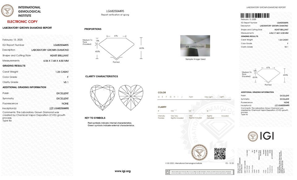 Terms Conditions:Kindly keep this in mind before making your purchase that we are selling our Lab grown diamonds on multiple platforms. The Diamond you receive will be exact color, clarity and cut. The only difference could be the IGI certificate which might differ from the listed stone. We highly appreciate your cooperation. LabIGIReport #-ShapeHeartCarat3.81ColorFClarityVS1Cut-PolishExcellentSymExcellentFluorNoneLocationNew York, United StatesDepth59.6%Table57%GirdleMED to THKCrown14.0%, 35.9Pavillion41.0%, 39.3CuletNoneMeas9.72 x 10.68 x 6.37Ratio0.91BGMNoneGrowth TypeCVDPlease note that we are listing all of our stone's color clarity grade as per IGI Lab Report. IGI Lab is the 2nd most reputable trustworthy Lab after GIA. Every person can have a different opinion about the color clarity of the stone. So the stones you are getting can be f to h in color vs1 to si1 in clarity grades as per GIA standards but as IGI standards those are as mentioned in the listing. how practical it is to use $75000 (3 Carat E VS!) Natural Diamond stone standard for the same color clarity grade (3 Carat EVS1) Lab Grown Stone which you are getting for $750. My advice to you is whatever authenticity says please please get the stone if you do not like then I will accept the return without any question in the next 30 days of purchase. I don't want you to miss the great opportunity to buy those beautiful lab grown stones which are 100% the same chemical other properties wise as natural Diamonds at 1% of price compared to Natural Diamond.