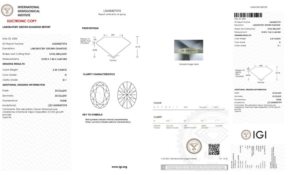 ? Please note that we will ship you same stone or exact similar stone with same color,clarity same carat weight certified stone. All Our Diamonds Are Certified And Laser inscripted.all of our diamonds are tested and certified with labs like IGI, GIA ,Etc.LabIGIReport #-ShapeOvalCarat1.01ColorGClaritySI1CutExcellentPolishExcellentSymExcellentFluorNoneLocationNew York, United StatesDepth62.3%Table59%GirdleSlightly Thick-MediumCrown-Pavillion-CuletNoneMeas8.16 x 5.65 x 3.52Ratio1.44BGMNoneGrowth TypeCVDPlease note that we are listing all of our stone's color clarity grade as per IGI Lab Report. IGI Lab is the 2nd most reputable trustworthy Lab after GIA. Every person can have a different opinion about the color clarity of the stone. So the stones you are getting can be one or two grades lower in color clarity grade as per GIA standards but as IGI standards those are as mentioned in the listing. So the stones you are getting can be g to i in color si1 to i1 in clarity grades as per GIA standards but as IGI standards those are as mentioned in the listing. how practical it is to use $75000 (3 Carat E VS!) Natural Diamond stone standard for the same color clarity grade (3 Carat EVS1) Lab Grown Stone which you are getting for $750. My advice to you is whatever authenticity says please please get the stone if you do not like then I will accept the return without any question in the next 30 days of purchase. I don't want you to miss the great opportunity to buy those beautiful lab grown stones which are 100% the same chemical other properties wise as natural Diamonds at 1% of price compared to Natural Diamond.