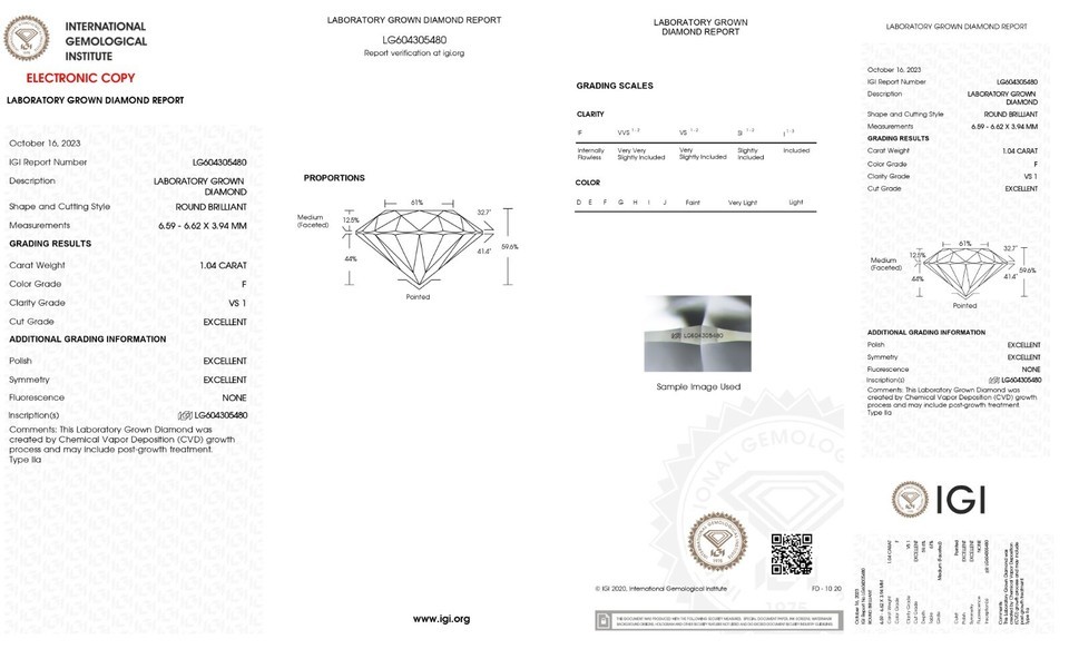 ? Please note that we will ship you same stone or exact similar stone with same color clarity same carat weight certified stone because we are wholesaler too, we sell on multiple Channels.LabIGIReport #-ShapeRoundCarat1.04ColorFClarityVS1CutIdealPolishExcellentSymExcellentFluor-LocationNew York, United StatesDepth60.7%Table59%Girdle-Crown0.0%, 0.0Pavillion0.0%, 0.0Culet-Meas6.59 x 6.62 x 3.94Ratio-BGMNoneGrowth TypeCVDPlease note that we are listing all of our stone's color clarity grade as per IGI Lab Report. IGI Lab is the 2nd most reputable trustworthy Lab after GIA. Every person can have a different opinion about the color clarity of the stone. So the stones you are getting can be one or two grades lower in color clarity grade as per GIA standards but as IGI standards those are as mentioned in the listing. So the stones you are getting can be f to h in color vs1 to si1 in clarity grades as per GIA standards but as IGI standards those are as mentioned in the listing. how practical it is to use $75000 (3 Carat E VS!) Natural Diamond stone standard for the same color clarity grade (3 Carat EVS1) Lab Grown Stone which you are getting for $750. My advice to you is whatever authenticity says please please get the stone if you do not like then I will accept the return without any question in the next 30 days of purchase. I don't want you to miss the great opportunity to buy those beautiful lab grown stones which are 100% the same chemical other properties wise as natural Diamonds at 1% of price compared to Natural Diamond.