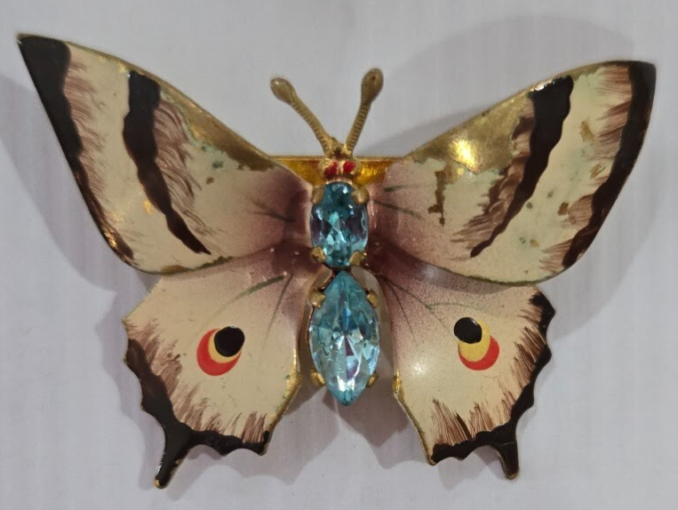 Vintage Czechoslovakia Hand-Painted Butterfly Brooch Aqua Blue Rhinestones Pin