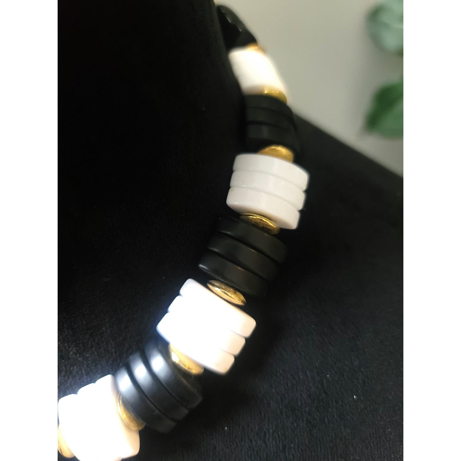 Women's Black White Beaded Necklace Gold Disc Accent Lobster Clasp Statement