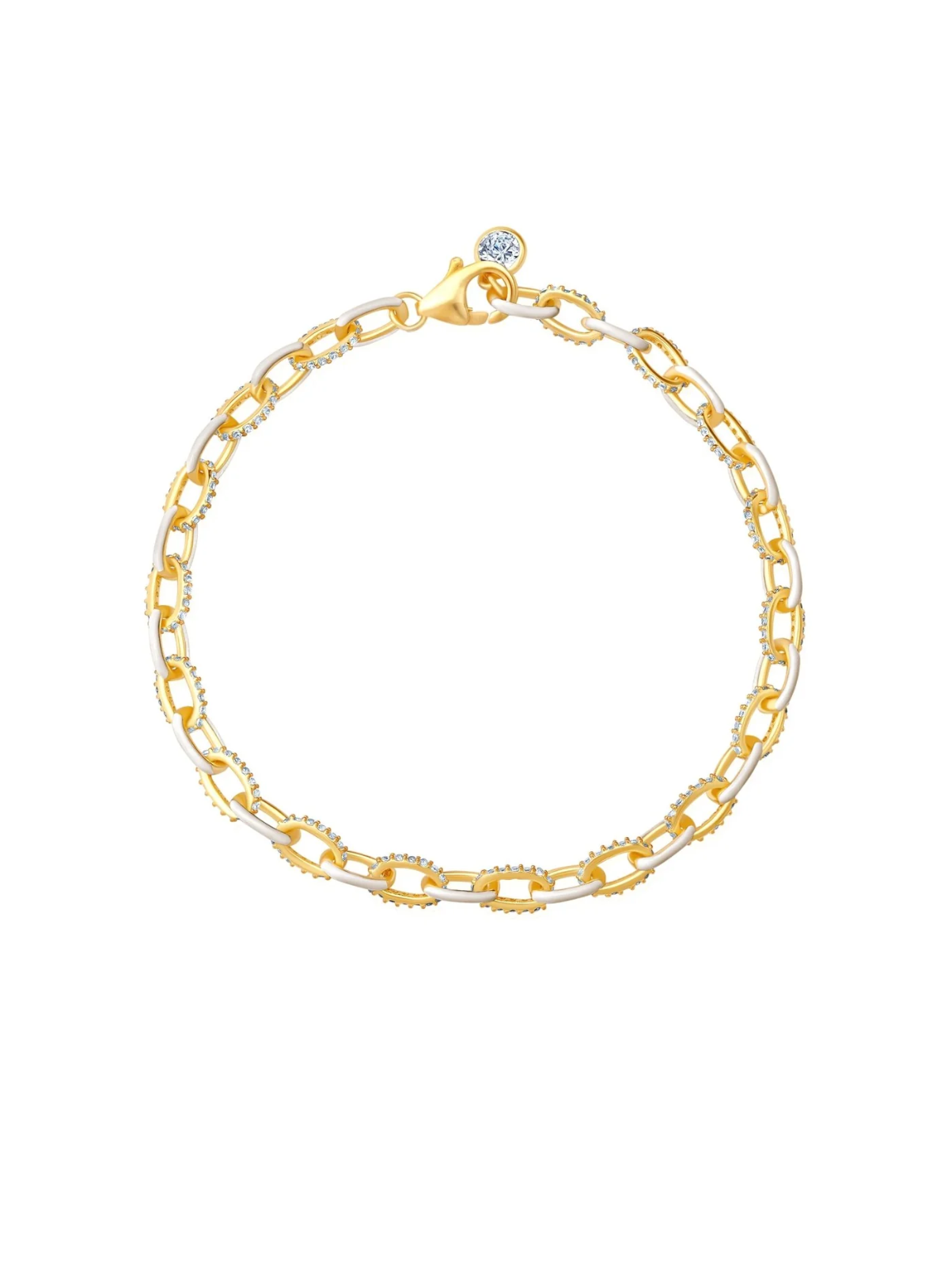 This bracelet features a linked chain of enamel white glaze and pave cubic zirconia. Elegantly crafted in .925 sterling silver and finished in 18kt yellow gold, this bracelet is extendable from 7 to 8 inches.