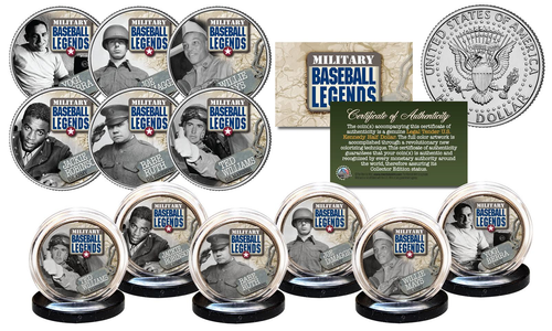 Here is your chance to own the MILITARY BASEBALL LEGENDS complete set of six (6) colorized JFK Kennedy Half Dollar U.S. Coins. These high-quality, genuine Legal Tender United States coins have been colorized using a unique painstaking multicolor authentic process by the Merrick Mint. Colorizing coins involves the unique application of special inks directly to the surface of a coin that achieves a level of detail, color saturation, and durability that is #1 in the coin industry. The result is an everlasting colorized coin collectible of ultra-high quality. Each coin comes in a premium coin capsule. The 6-coin set comes with a Certificate of Authenticity to guarantee that your coins are authentic and recognized by every monetary authority around the world, assuring its Collector Edition status. The Kennedy half dollar is a U.S. fifty cent coin with coin year and mint marks chosen at random.
