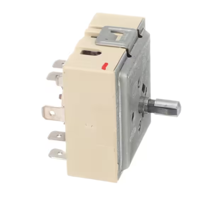 The Whirlpool 9758060 Infinite Switch (part number 50.55073.095) is a surface burner control switch designed to regulate heat levels on your electric cooktop or range. Operating at 240V and 15 amps, it allows for precise temperature adjustment by controlling the power output to the burner. If your cooktop element won't heat properly or stays stuck on a single setting, this switch is likely the solution.