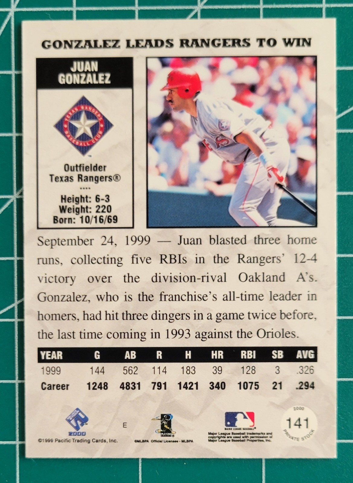 2000 Pacific Trading Card Private Stock Juan Gonzalez Card #141.