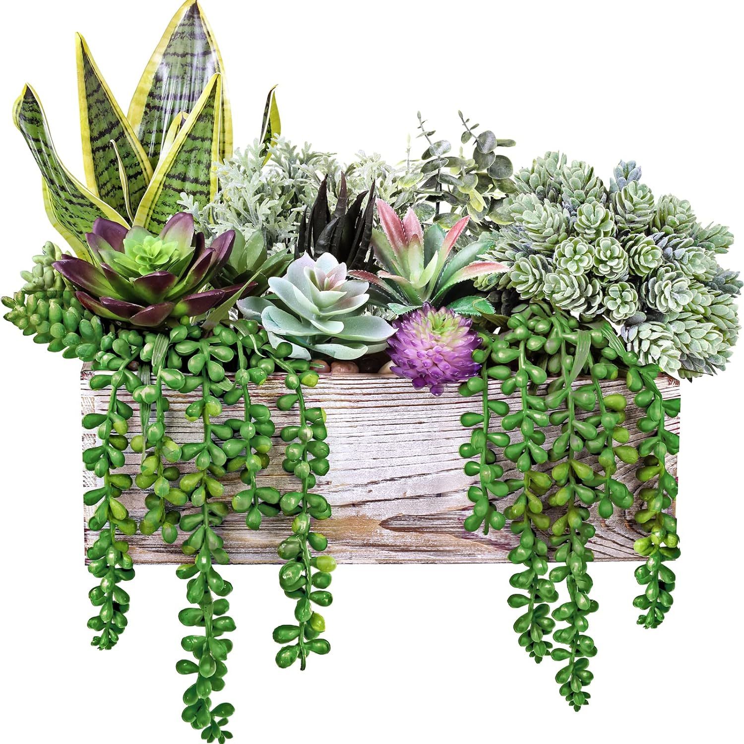 Quantity: Artificial Pre-Made Succulent Arrangement is a blend of 14 pcs faux succulent plants and greenery arranged in a rustic rectangle wooden planter box. This arrangement includes String of Pearls, Echeveria, Burro's Tail, Sansevieria, Sedum, Flocked Hops, Aloe, Agave, Eucalyptus Sprigs, Snake plant and Flocked Dusty Miller Sprigs. Color: This artificial succulent plant arrangement is overflowing with a wide variety of faux succulents in various shades of green and purple with lots of texture. The succulents come artfully potted in a distressed wooden planter box given a rustic look to blend in any farmhouse decor style. Natural pebbles are added for realism. Size: Faux succulent arrangement measures about 11.3" x 3.7" x 15.7" (LxWxH). This plant arrangement is the perfect accent on shelf, desk, countertop, and windowsill. Material: Artificial succulent garden is made of latex and plastic and comes set in natural wood planter with foam soil and natural pebbles. No watering, sunlight or additional maintenance is required to keep them healthy. Artificial succulent arrangement is great decor accent on shelves, fireplace mantel, coffee table, desktop, windowsill, kitchen countertop, entryway table, bathroom counter, cabinet, nightstand, end table, anywhere that needs a touch of green. Or use it as centerpiece for your dining table, a wedding, bridal or baby shower, events, and party. It also makes a perfect housewarming gift, sympathy gift, birthday gift, holiday gift, client gift, and gift for special occasion.
