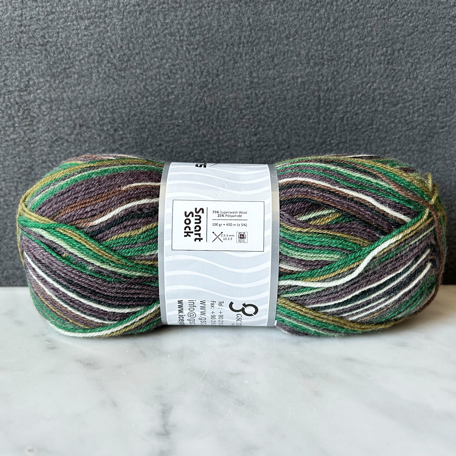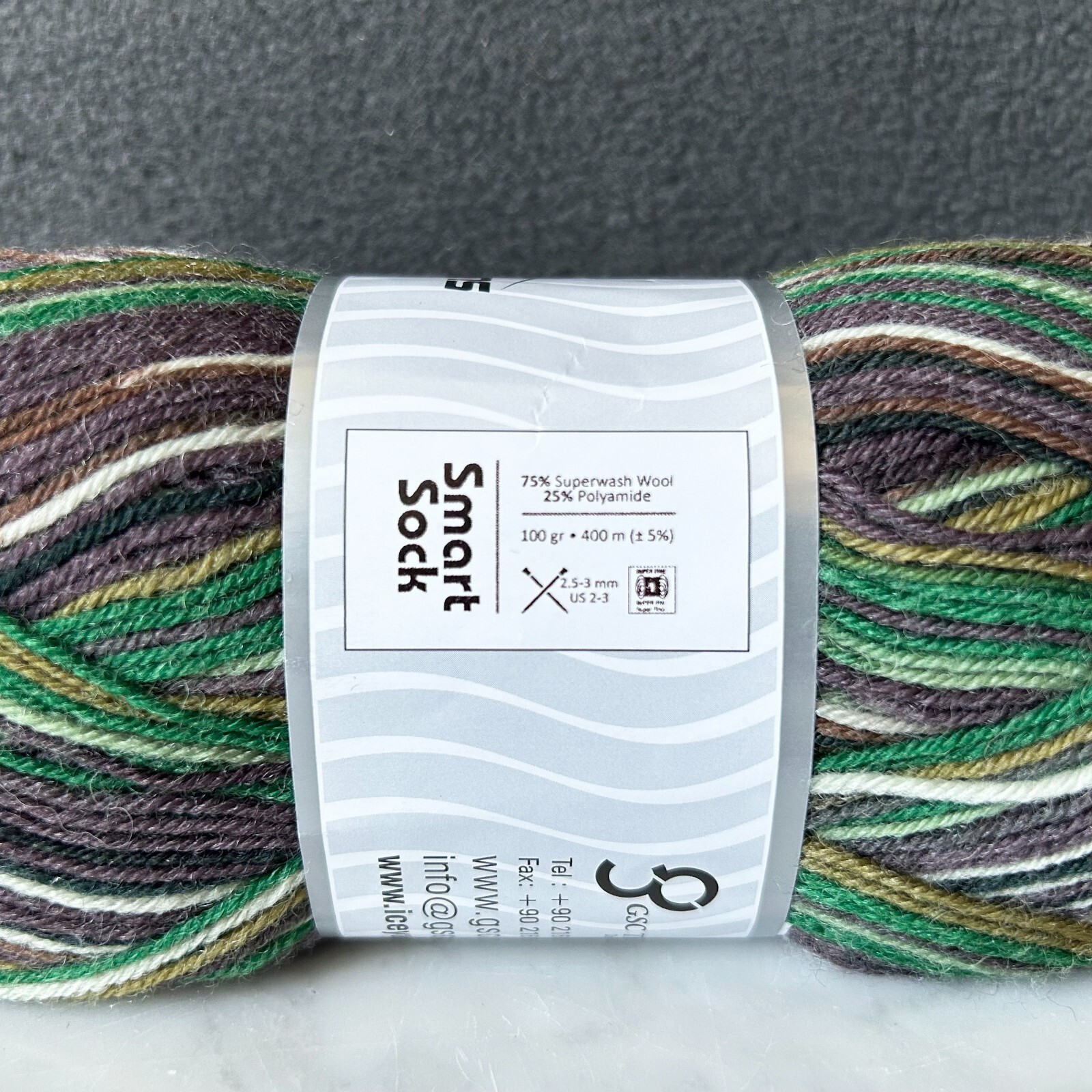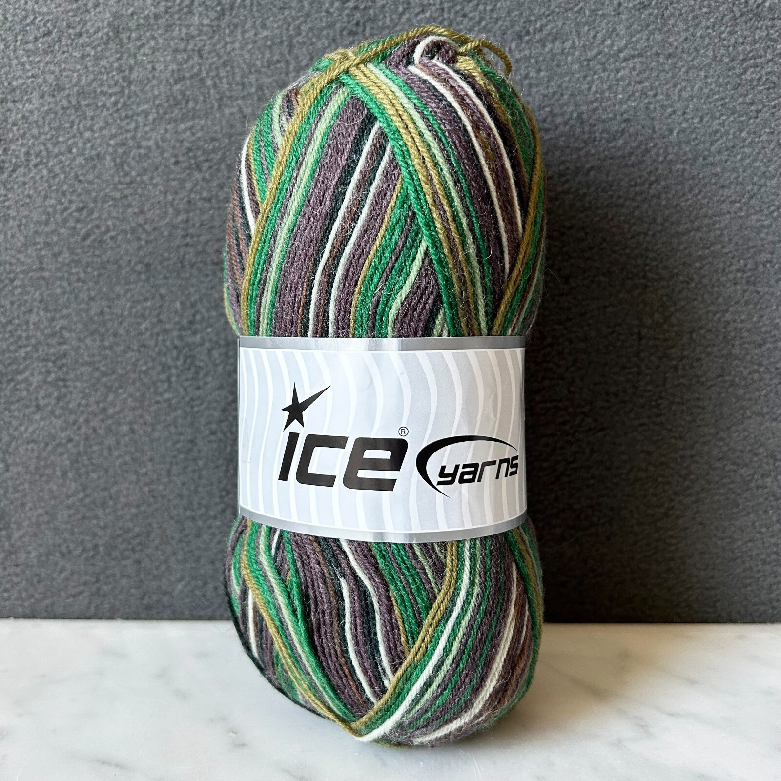 One ball/skein of Ice Yarns Smart Socks yarn. Variegated colors: Brown, Green, Black, Blue-Grey. 75% Superwash Wool, 25% Nylon/Polyamide; machine wash and dry.