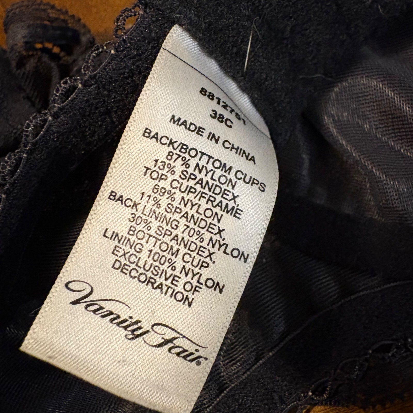 Vanity Fair Black Lace Underwire Bra 38C Nylon/Spandex Womens Lingerie Adjustabl