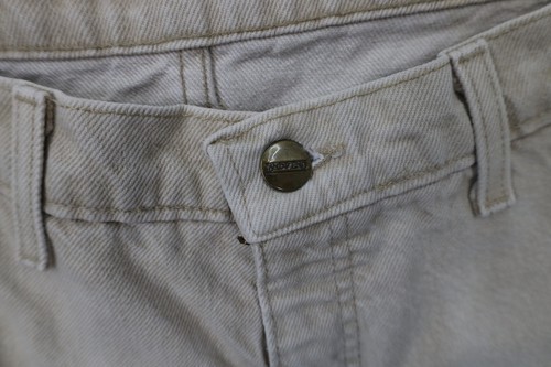 Sun fade, blemishes, discoloring front and back both legs. Patch has loose thread. Cuffs, fly, waist discolored. Loose threads waist. USA made