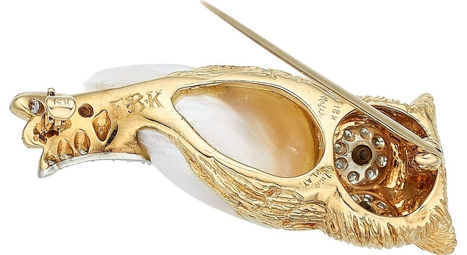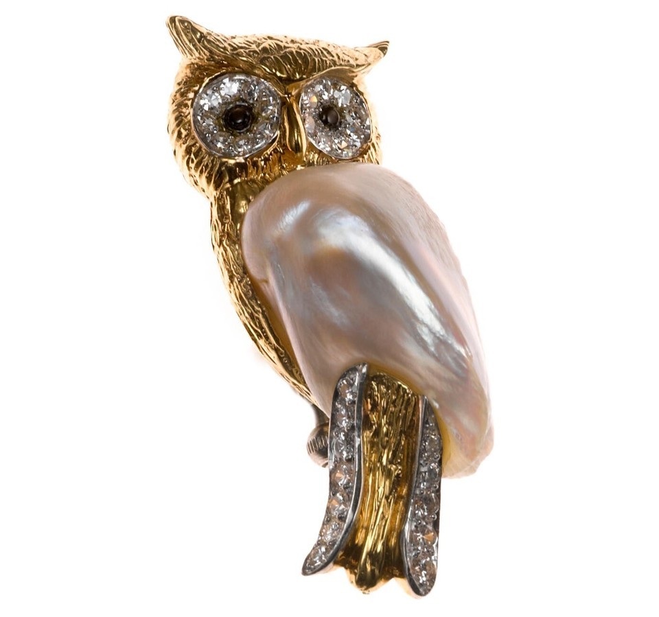 Ruser 18k Yellow Gold Freshwater Cultured Pearl Owl Brooch 0.60 ct Diamond