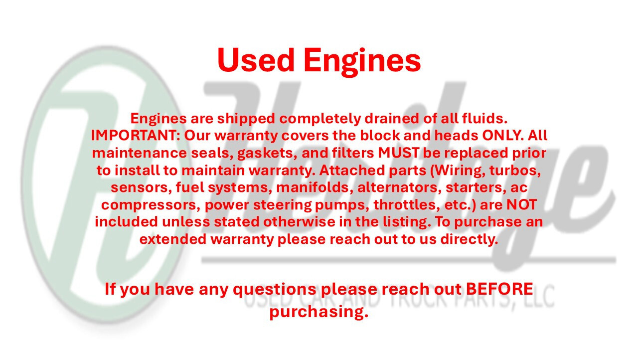 Some vehicles have different specs that must be matched to ensure fit. If you have any questions about if this part will fit your vehicle, please call or text 251-375-2135 Engines are warranted as a long block only. A long block consists of a block and head(s). Attached parts (Wiring, turbos, sensors, fuel systems, manifolds, alternators, starters, ac compressors, power steering pumps, throttles, etc.) are NOT included unless stated otherwise in the listing. If any of the attaching parts are left on the engine, they are not covered by warranty. These engines are sold with the understanding that wiring, sensors, fuel systems, manifolds, etc. may need to be changed to fit your application (these items may or may not be on the engine.) All maintenance seals, gaskets, and filters MUST be replaced prior to install to maintain warranty. Engines are shipped completely drained of all fluids. IMPORTANT: Our warranty covers the block and heads ONLY. This is a freight item, all excessively large or heavy items must be sent via freight truck. Item must be sent to a commercially zoned address capable and willing to unload the freight. Alternatively, item may be picked up from a freight terminal (We can locate a terminal closest to you if you supply us with your ZIP code). If those options do not work for you, item can be sent to a residential home address for an additional $85 fee. If you cannot unload the item and require unloading, an additional $85 fee will apply. Hospitals, Schools, Farms, Storage Units, Home Business, Airports, No Truck/Limited Access zones and Military Bases are not accepted as a valid commercially zoned address.