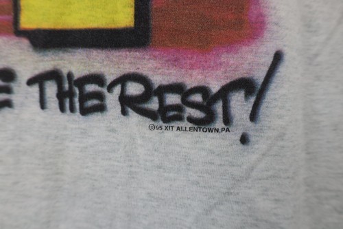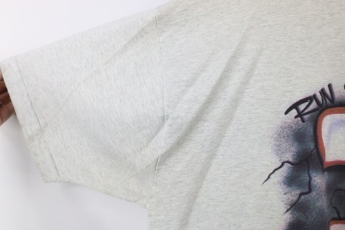 Blemishes/discoloring throughout. Collar stained. Collar, arms, front, back discolored. Graphics, color faded. Pilling. Made in USA