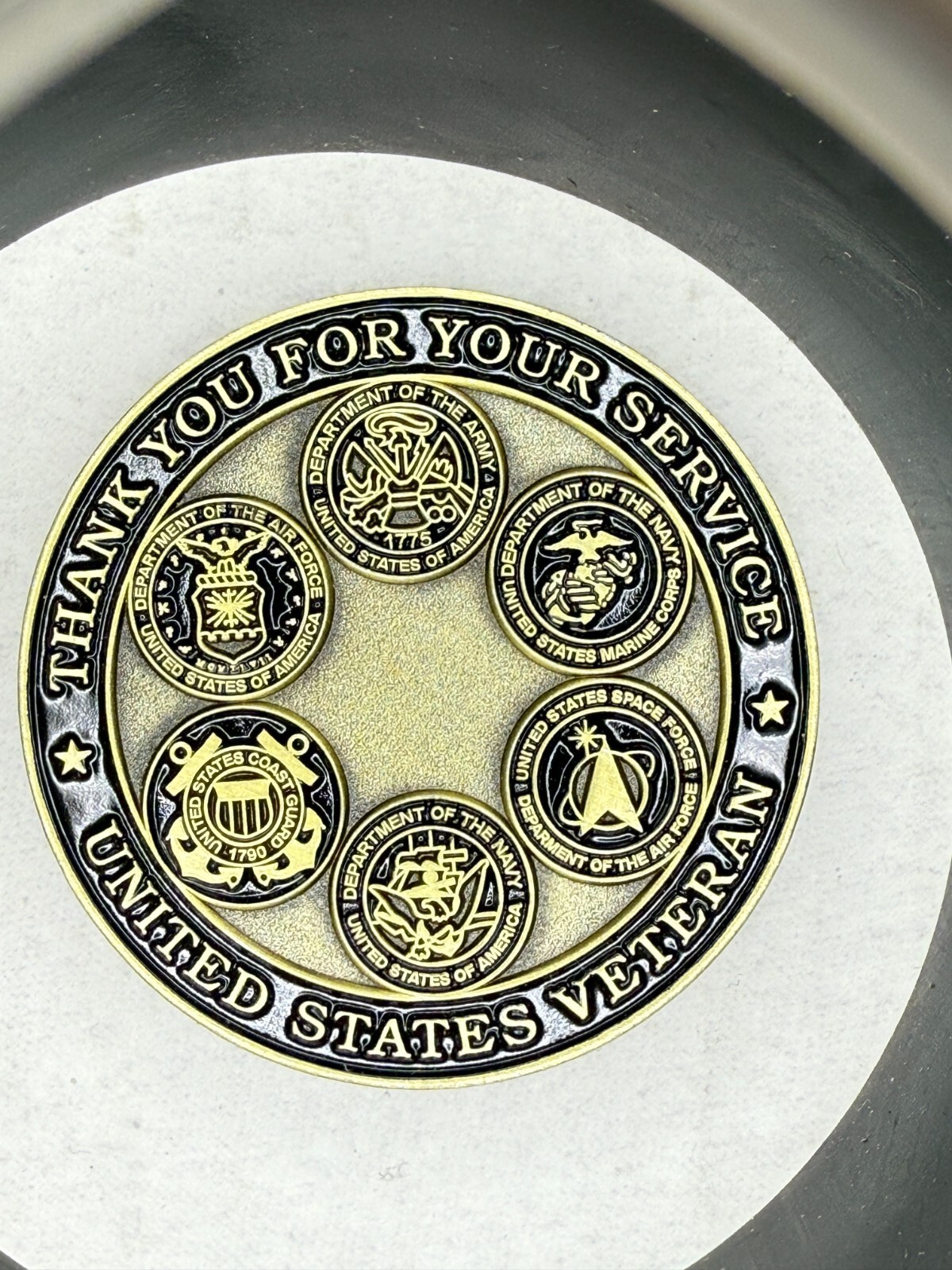 The "HyVee Homefront 2024 Thank you for your service Military Challenge Coin" is an original police collectible challenge coin manufactured in the United States. It features a design that expresses gratitude for the service of military members. This coin is a unique and meaningful piece that can be a valuable addition to any challenge coin collection, especially for those interested in honoring military service and showing appreciation for their dedication. from a pet and smoke free home