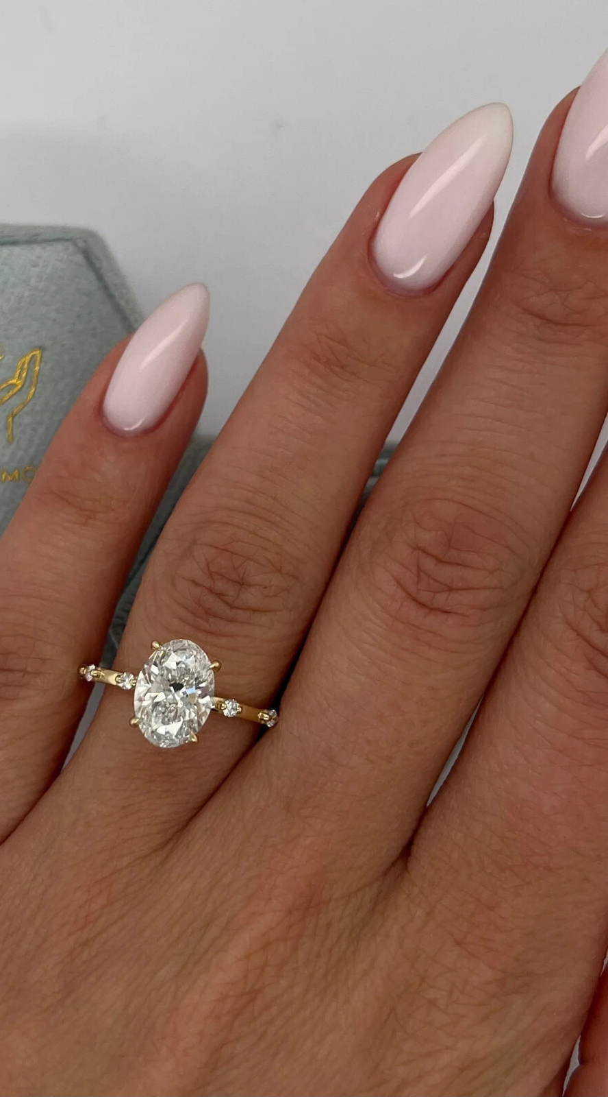 Discover refined beauty with our lab grown oval diamond ring, available in 1.00 Ct to 2.50 Ct center stones paired with 0.10 Ct delicate side stones, totaling 1.10?2.60 Ct. Handcrafted in solid 14K gold (your choice of yellow, white, or rose gold), this ring offers a stunning balance of brilliance and sophistication.