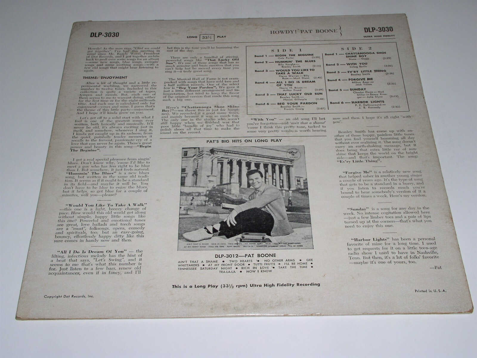 This is a vintage phonograph record album vinyl LP entitled, "Pat Boone, Howdy!". Record label Dot DLP-3030.
