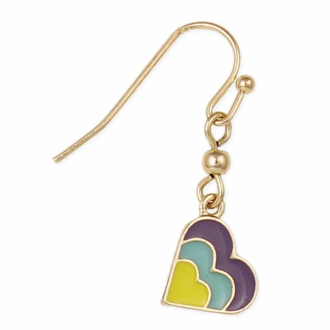 Retro heart earrings in gold for a sweet touch to your look. Gold earring includes purple, turquoise and lime heart dangle in fun pastel colors.