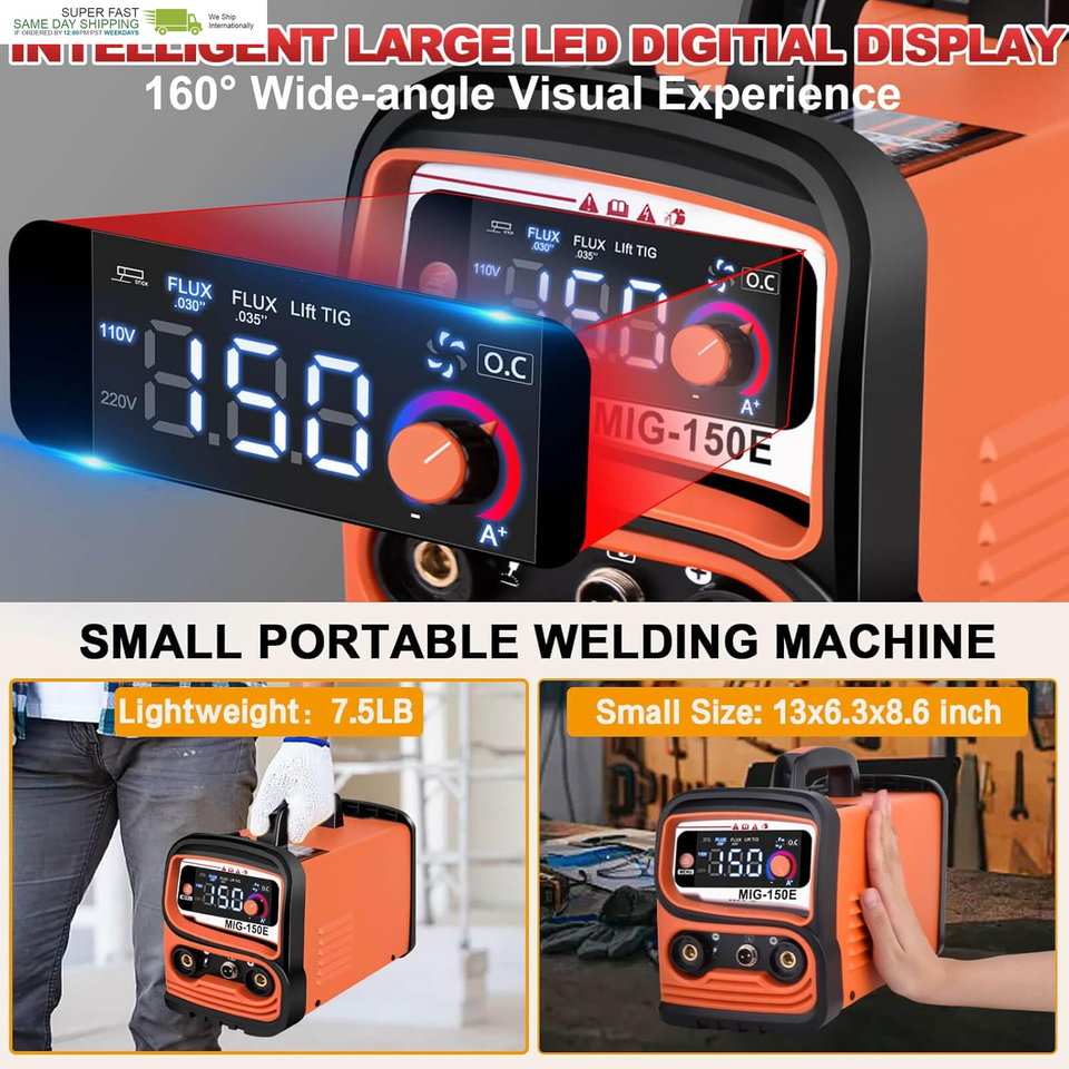 ?LARGE LED DIGITAL DISPLAY PORTABLE?The MIG Welder is equipped with a large, high-brightness LED digital display, which can be used at night or in low-light environments to clearly visualize real-time current, voltage and other parameters,intuitive and easy to operate. The portable welding machine size is 13x6.3x8.6 inches and weight only 7.5LB. It is lighter and easier to carry than gas MIG welders and other welders, ideal tool for garages, outdoor construction.
