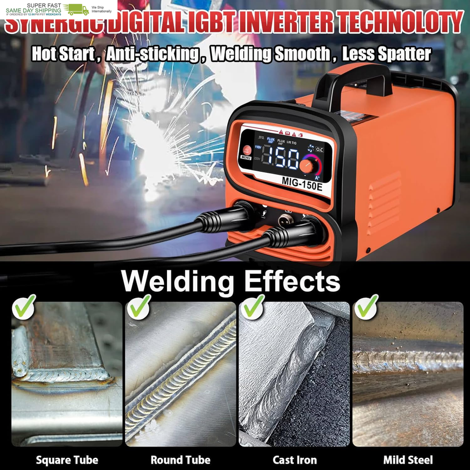?3 IN 1 VERSATILE WELDING MACHINE?The welder machine has flux core MIG welder, stick welder and lift TIG(Need to buy extra Lift tig torch) 3 modes, with an output current of up to 150amps, it can perfectly weld stainless steel, carbon steel and even thicker steel, and can easily cope with the use scenarios of automobile exhaust pipes, home repairs and DIY projects, it is a must-have tool for every homeowner.
